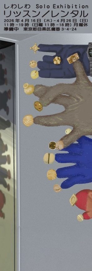 音楽家としても活躍する美術家・しわしわ(五番街マック, 消極的レジャー, ジョンのサン, omashi)が、ソロ・エキシビション「リッスン/レンタル」を4月16日(木)から26(日)まで東京・学芸大学 準備中にて開催。