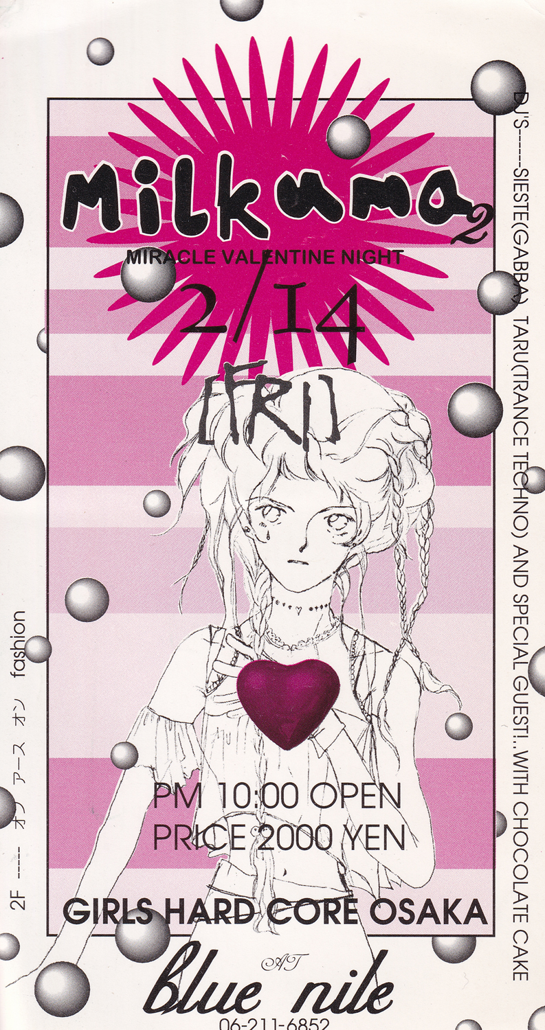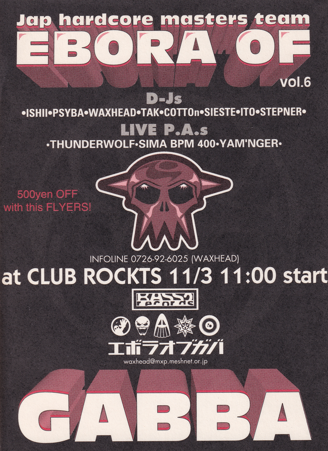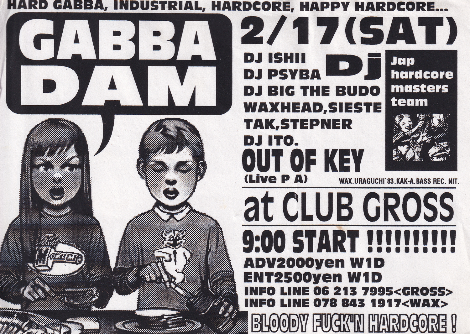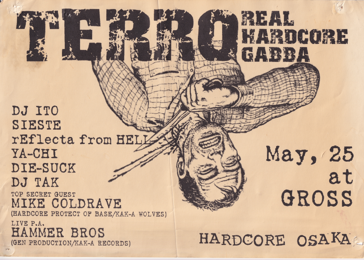「23歳の頃だと思います。OUT OF KEYのメンバーであるYam YamやSyntax(山本シゲトモ)にテクノのおもしろさを教わりました。OUT OF KEYは音源はもちろん、見せかたもかっこよくて、近くで見ることができたのは恵まれていたと思います。品揃えがおもしろいレコード・ショップも多かったので、じっくり試聴したり、発見を楽しみながら好みのレコードを集めていました。そこでPCP(Planet Core Productions | Marc Acardipane + Slam Burt主宰レーベル)のレコードに出会ったのも大きかったです。また、ハードコアやガバはまだ認知度が低かったので、同じジャンルが好きな稀少な人たちが強い力で繋がったのも、情報量やシーンが加速していった要因だと思います」