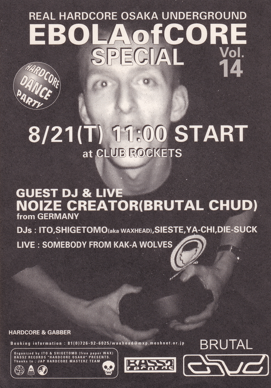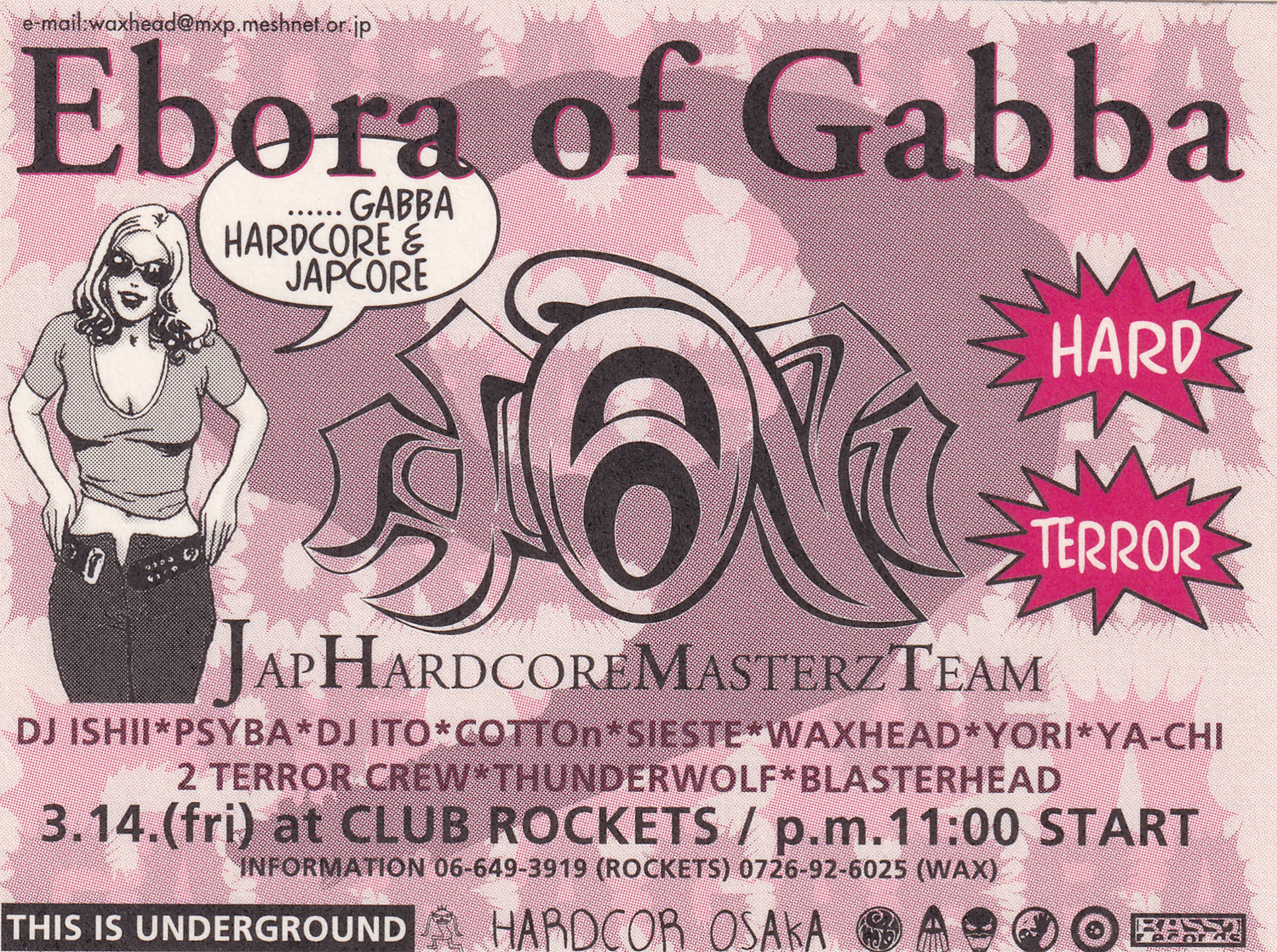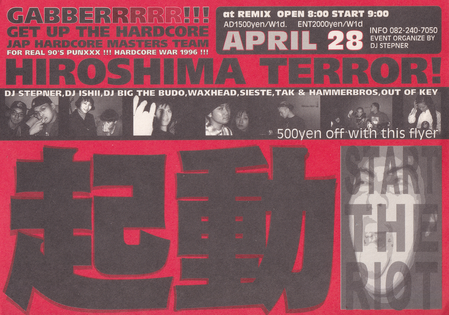 「まだジャンルなどもはっきりと意識していない頃に、Fiber Zoomという美容室が主催するクラブ・イベントのファッション・ショウに参加しました。そのときになんとなくDJもやってみることになったのが最初です。JAP HARDCORE MASTERZ TEAMのメインではないので、成り立ちに関わってはいないのですが、関西でジン(『WAX』)を作っていたOUT OF KEYと、同時期に東京でジン(『裏口入学 '83』)を作っていたHAMMER BROSが繋がり、どんどん大所帯になっていく中でメンバーに入れてもらっていたという感じです」