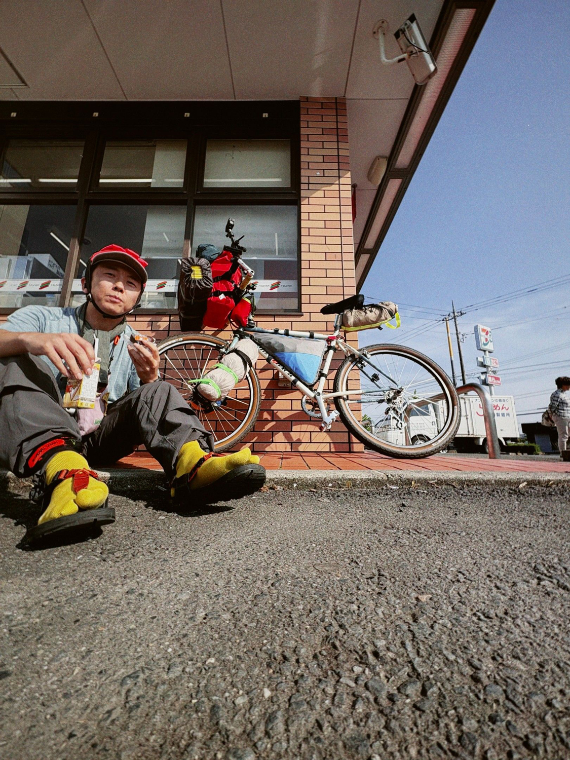 まだ何も食べていなかったが、自転車を置いておくのが不安だし、せっかくこれから港に行くなら海鮮を食べたいよね、という気持ちで水戸から離れることにした。大洗までの道のりは向かい風と自転車の感覚がつかめずに、たった12kmなのに、途中で寄ったコンビニで座り込んでしまった。コンビニで座り込んで休む感じがかっこいいと思い自撮りしていたら、飲み物もこぼし、チョコはべっとりついた。ナビは一番きつい坂を行けと言うし、ギアの調子も悪い。苫小牧で一度自転車を見てもらおうと決めた。