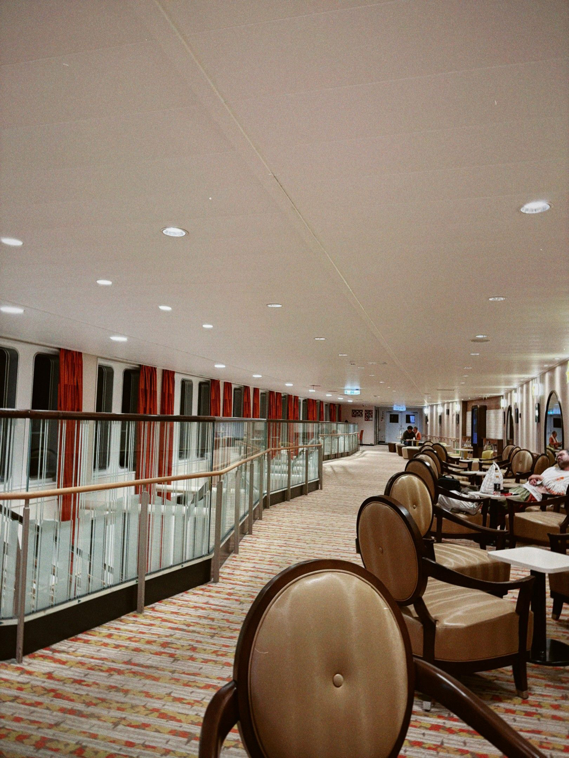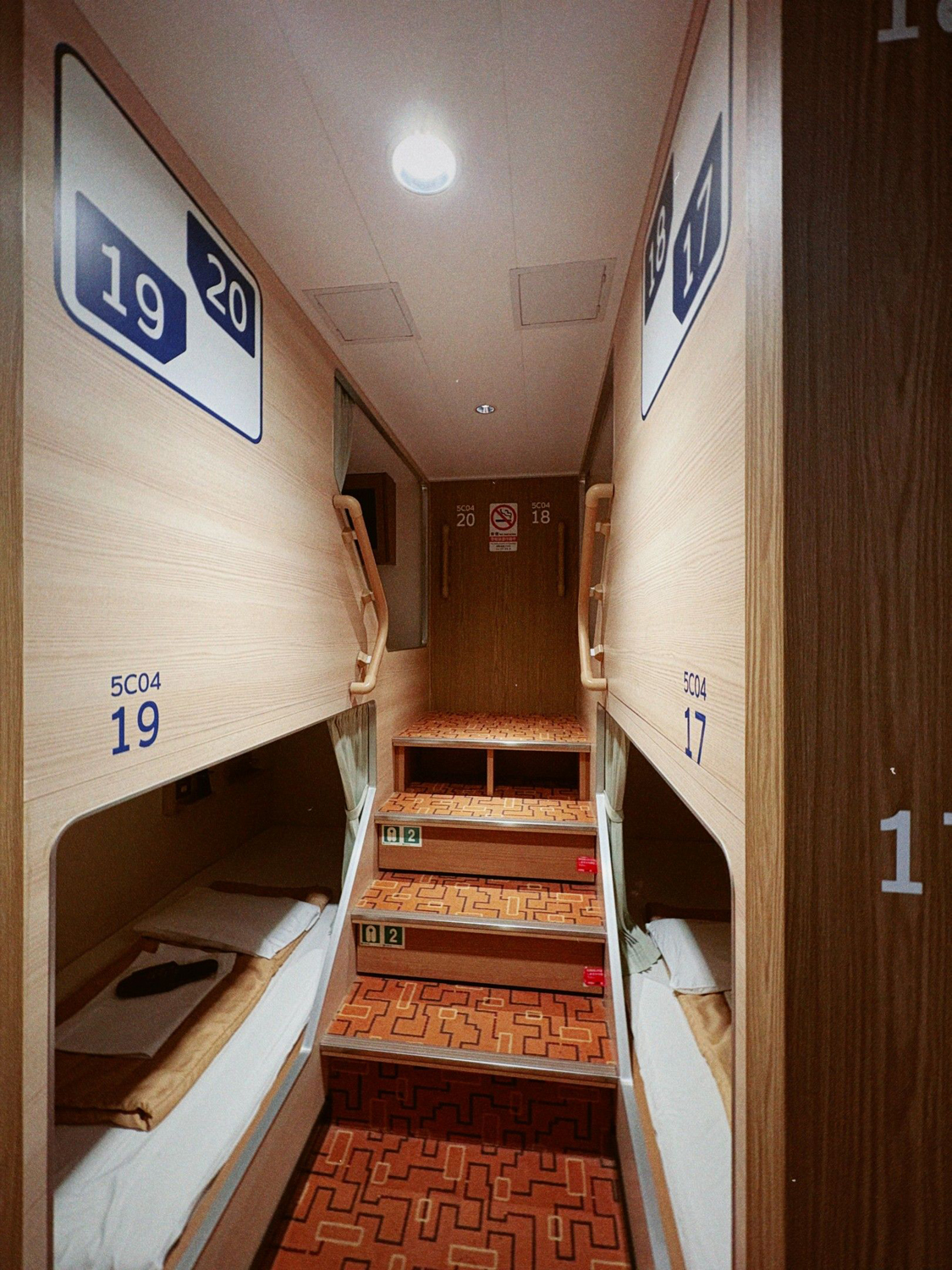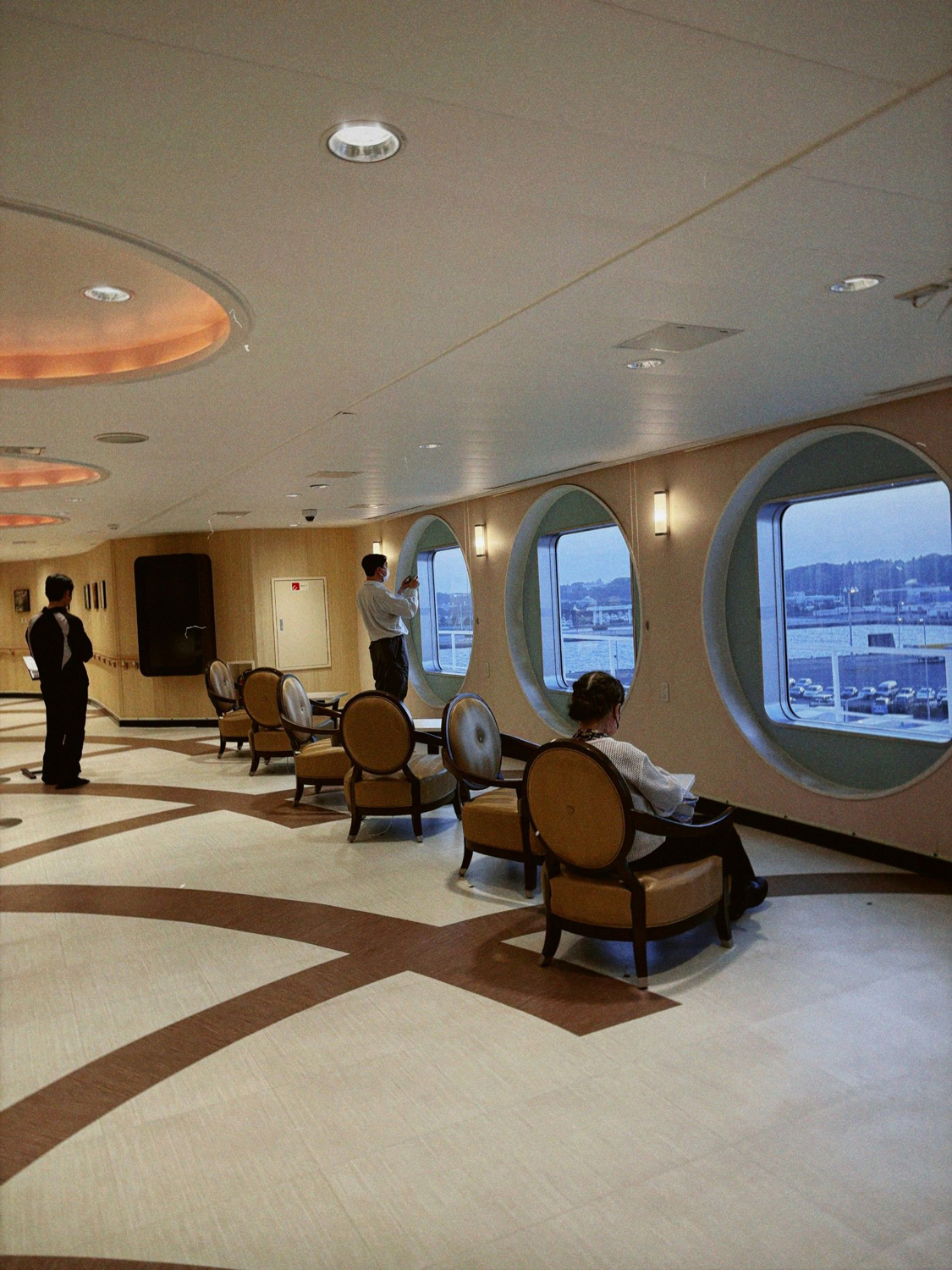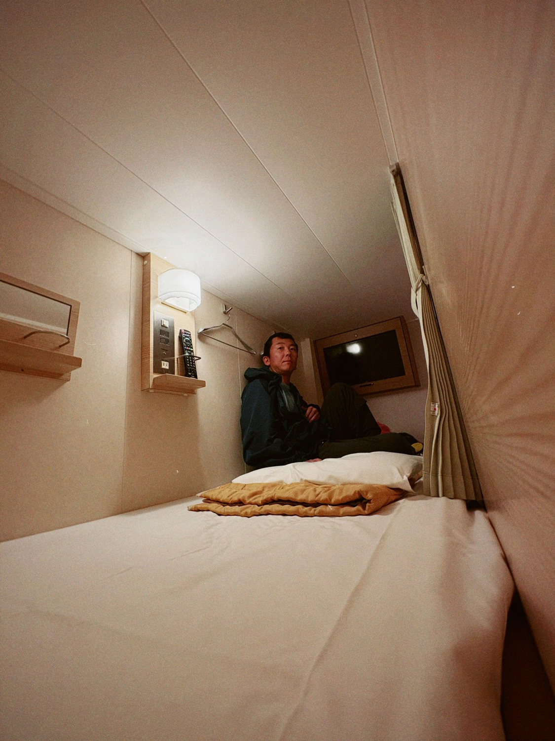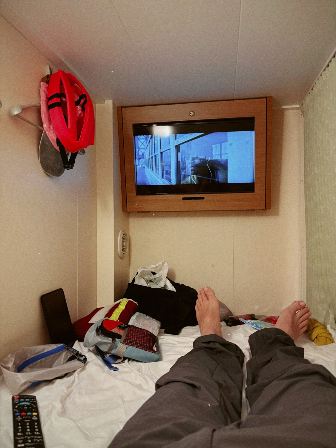 夕方になってフェリーに乗船。ここから17時間、船で過ごす。到着は翌日の13時だ。フェリーの中は快適。郊外の公共施設のような雰囲気で味気ない感じが妙に落ち着く。コンフォートというランクの寝室で、カプセルホテルと同じような空間。テレビも付いている。