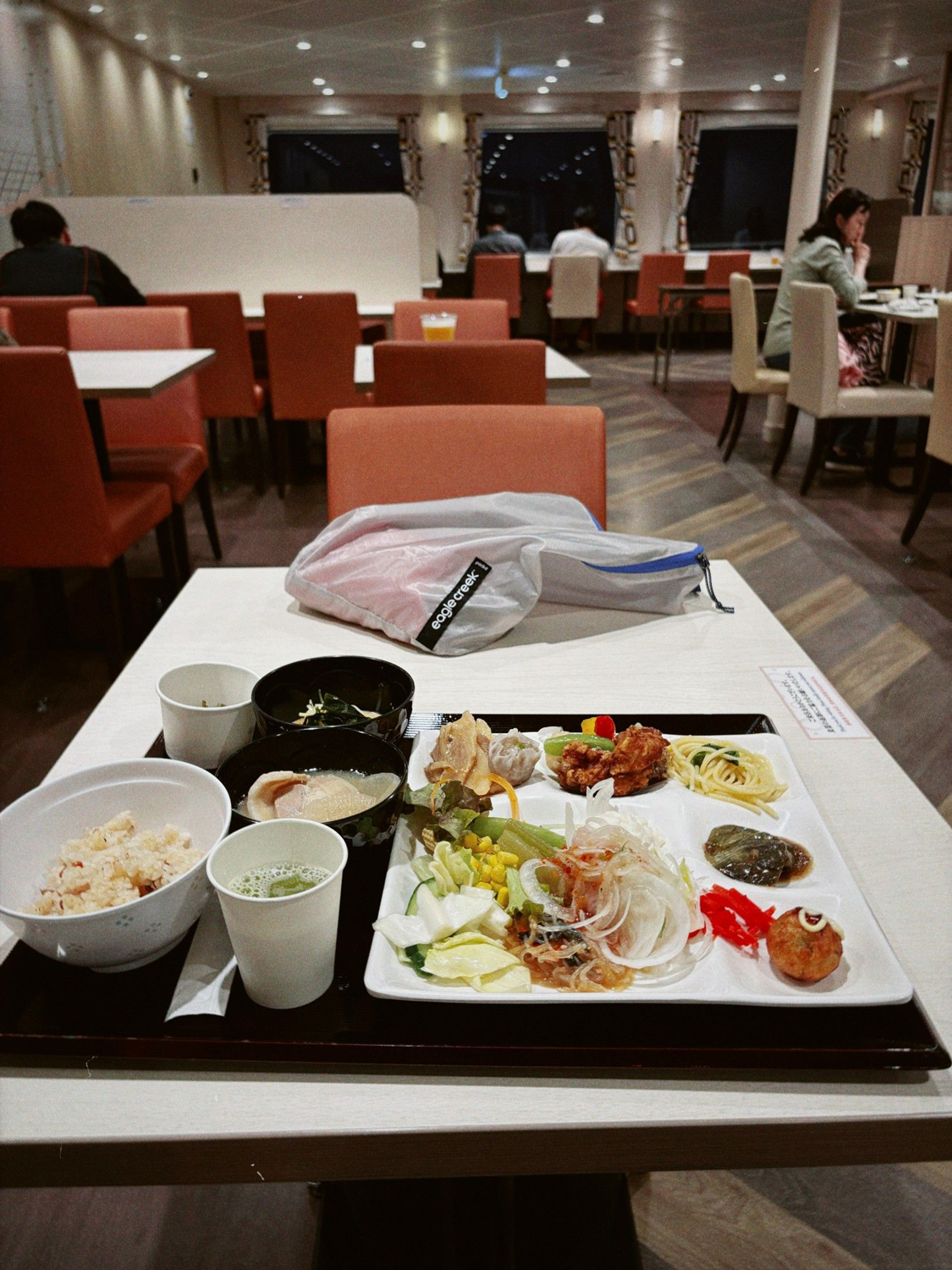 夕食はバイキング。港で食事をしてから時間が経っていなかったので1周でお腹いっぱいになったが、人の盛り付けを見て「それでお腹いっぱいになるだろ」とか「その手があったか」など、頭の中で喋っていると楽しい。ひとりで食べるバイキングはそっけないが楽しみかたはたくさんあった。