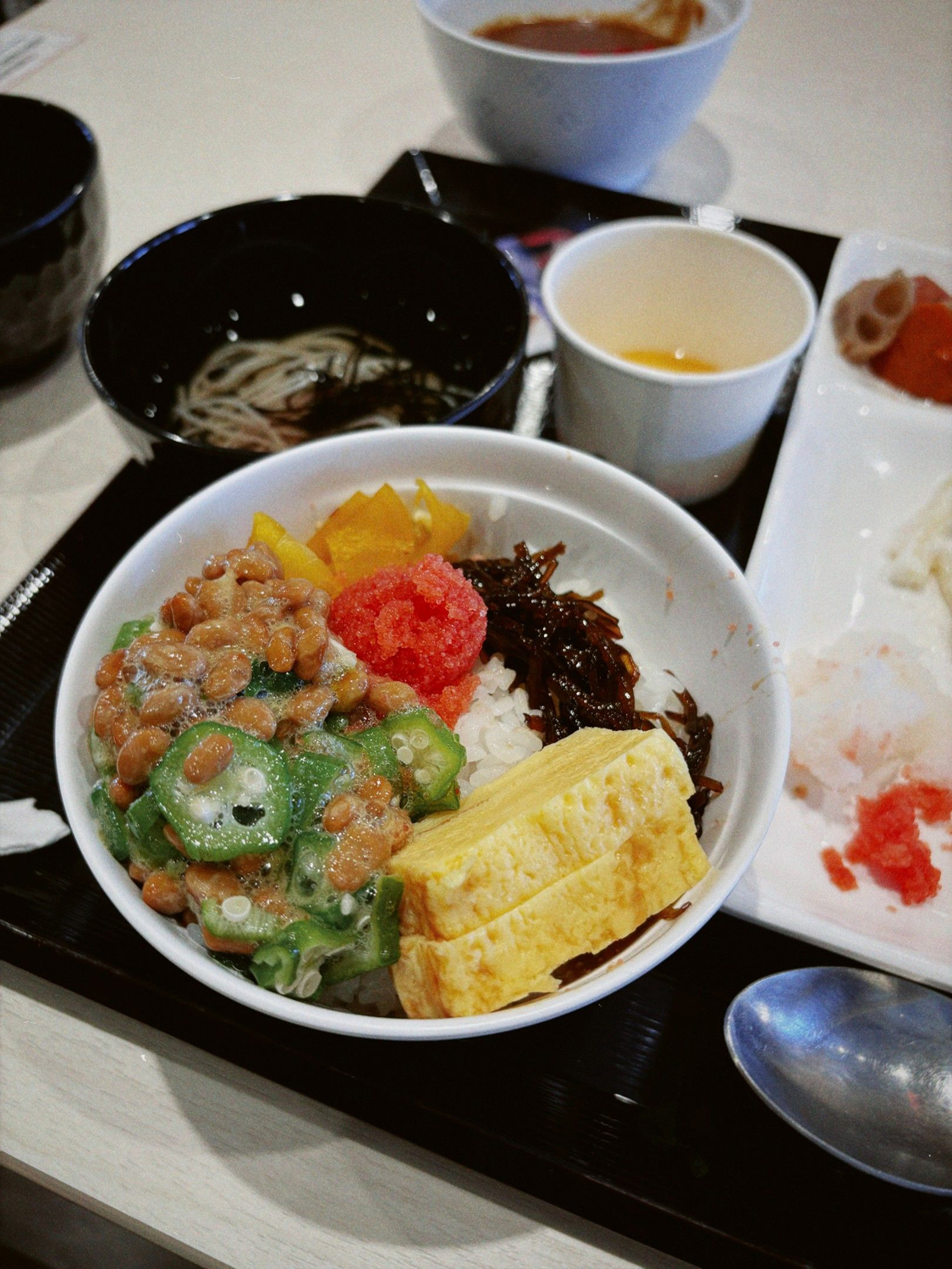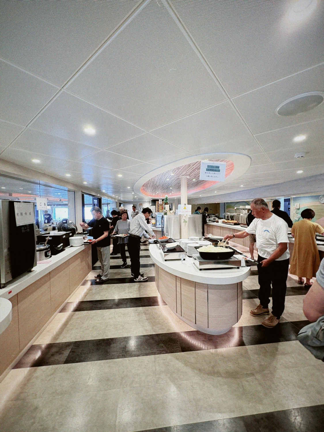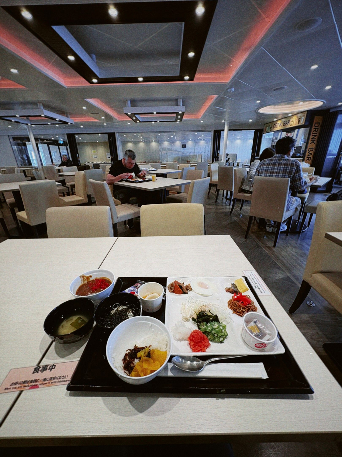 風呂上がりに外の風を浴びていると朝食のアナウンス。朝もバイキング。お腹も空いてきた。とにかく時間があるので、時間を目一杯使って3回分の食事をする。他の人の盛り付けを頭の中で批評して過ごす。