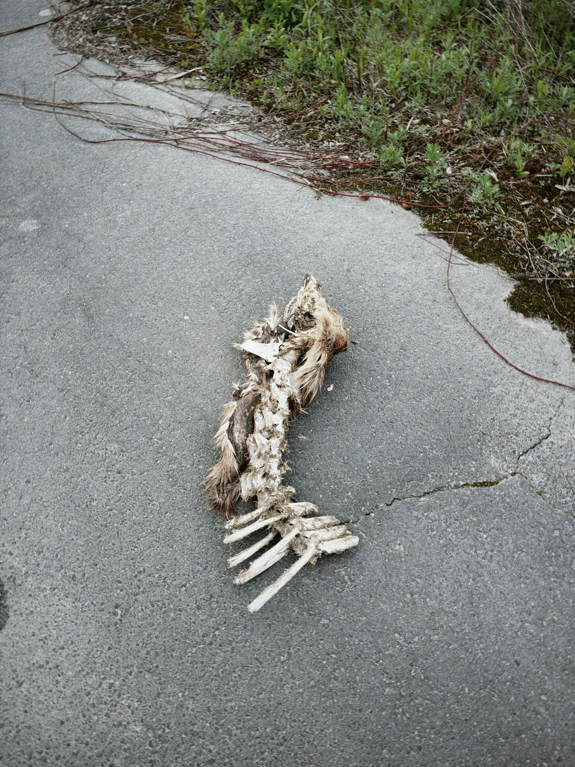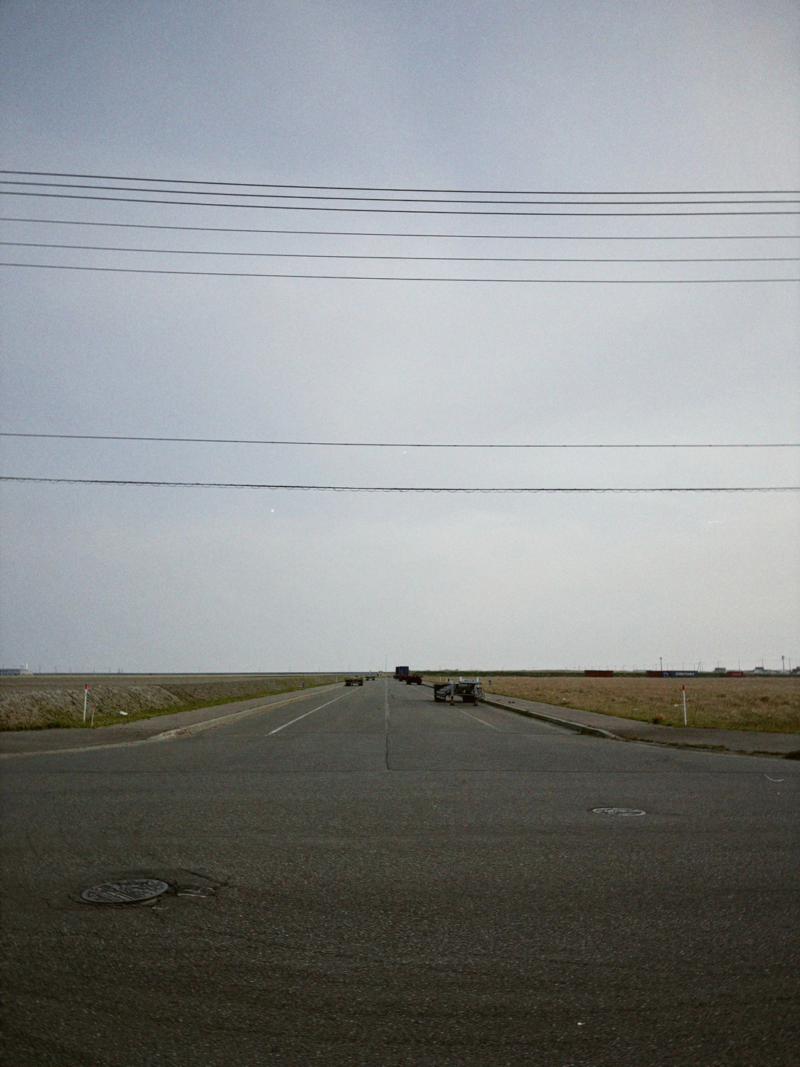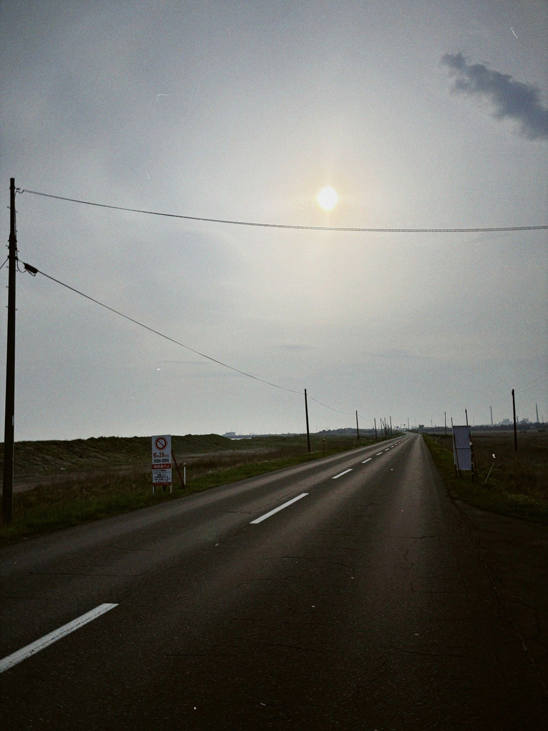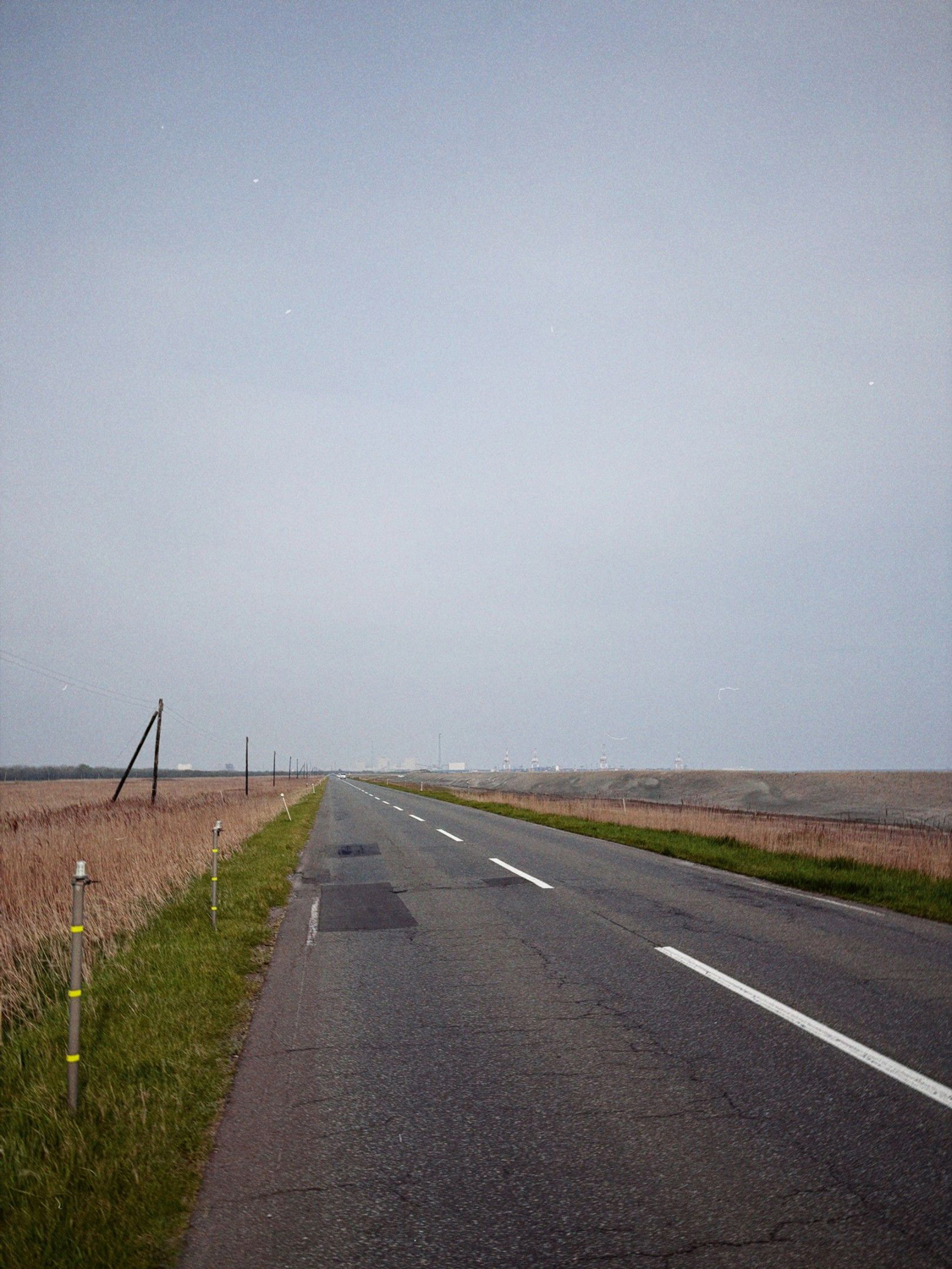 勇払から浜厚真駅までの10km。風が強くて自転車が進まない。大型トラックも多い。地平線まで一直線の道でスピードも速い。すれ違う度にに衝撃波のような風が当たる。トラックが来るたびに叫んで気を紛らす。途中、骨になった狐を見つけて生き物の痕跡をみつけ少し安心したがそれ以外何もなかった。