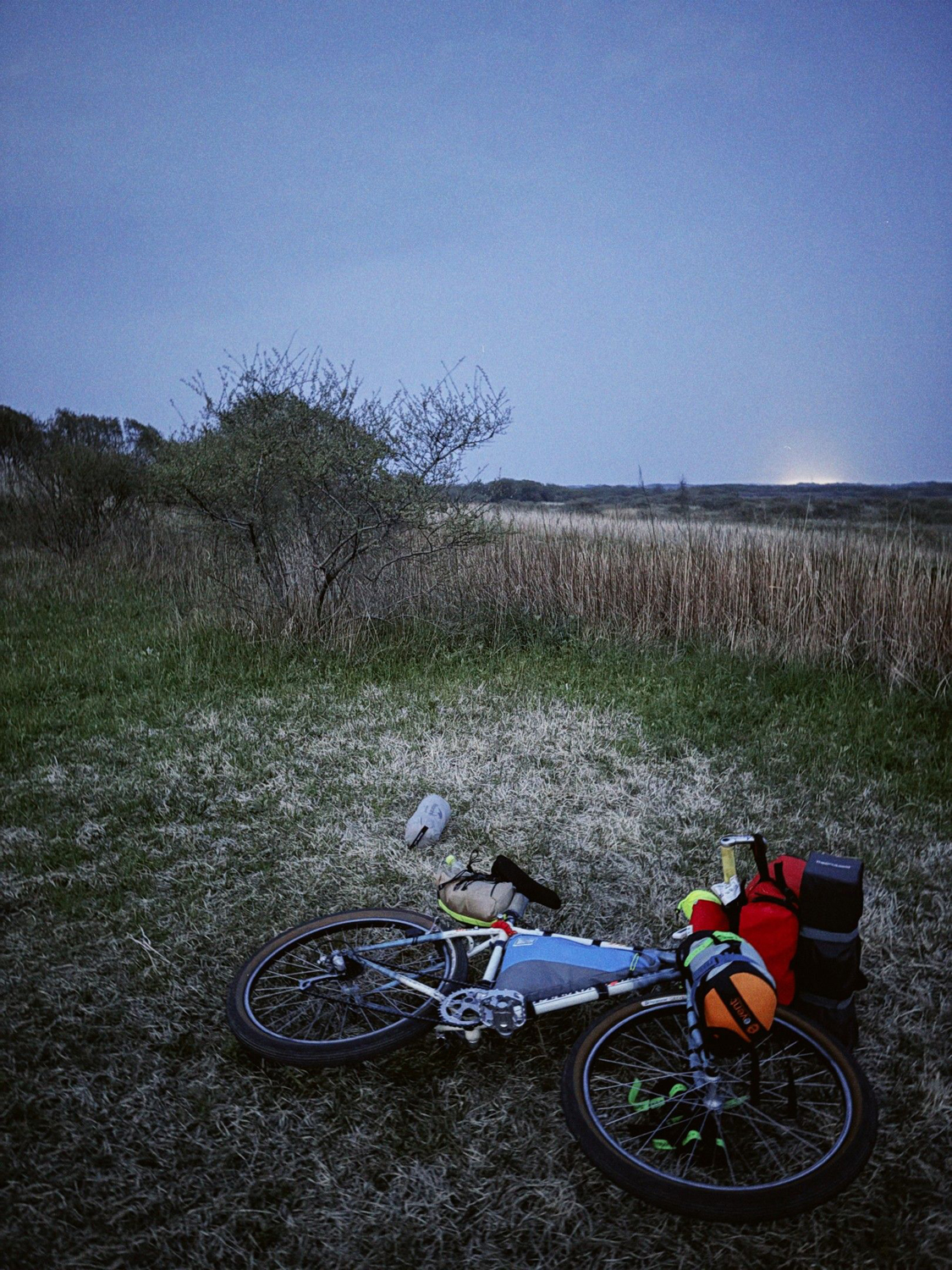 日が暮れたかけた頃、目的地の「むかわ温泉 四季の湯」に到着。振り返ればたった35kmだが、とてつもなく遠かった印象。疲れたけどまだやることはある。野営地探し。暗くなる前に野営しても安全そうな場所を探す。事前に、Googleの航空写真とストリートビューで気になる箇所に当たりをつけている。今回は海の近くの原っぱを拠点にすることにした。野営地探しのコツはもっと細かくあるんだけど、また別の機会に。