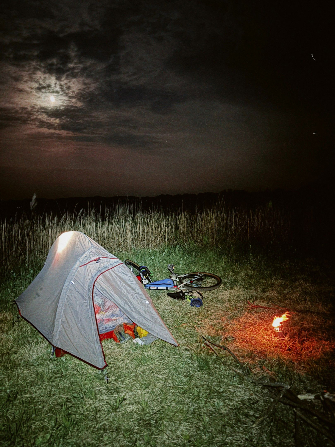 場所探しでうろうろしていたら暗くなってしまった。テントを設営して、焚き火用の枯れ木を集めておく。旅で焚火なんて面倒なのだけれど、今日はどうしても焚火をしたい。新しく買った焚き火台もあるし使いたい(どうしても試したいんです!)。暗くて気づかなかったが、テントの入り口にうんこがあった。大きさ的に熊じゃないが、いつか踏むくらい目の前にあった。踏まないように枯れ木を集中させて置いた(別に踏んでもいいんだけど)。