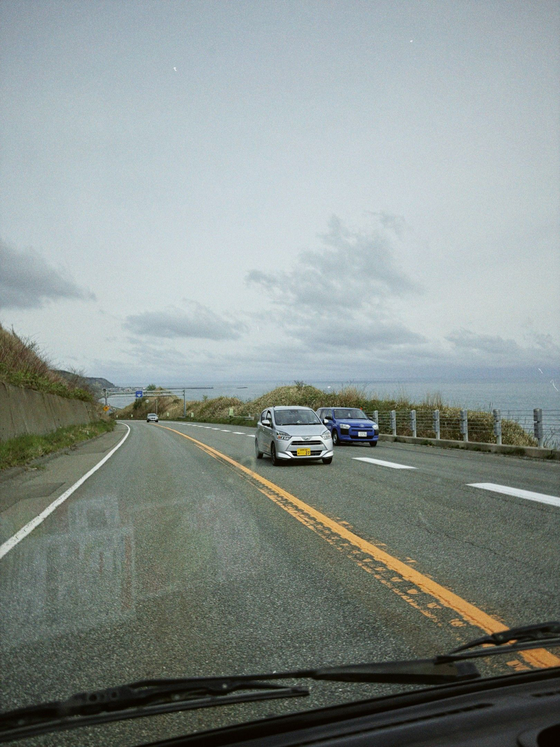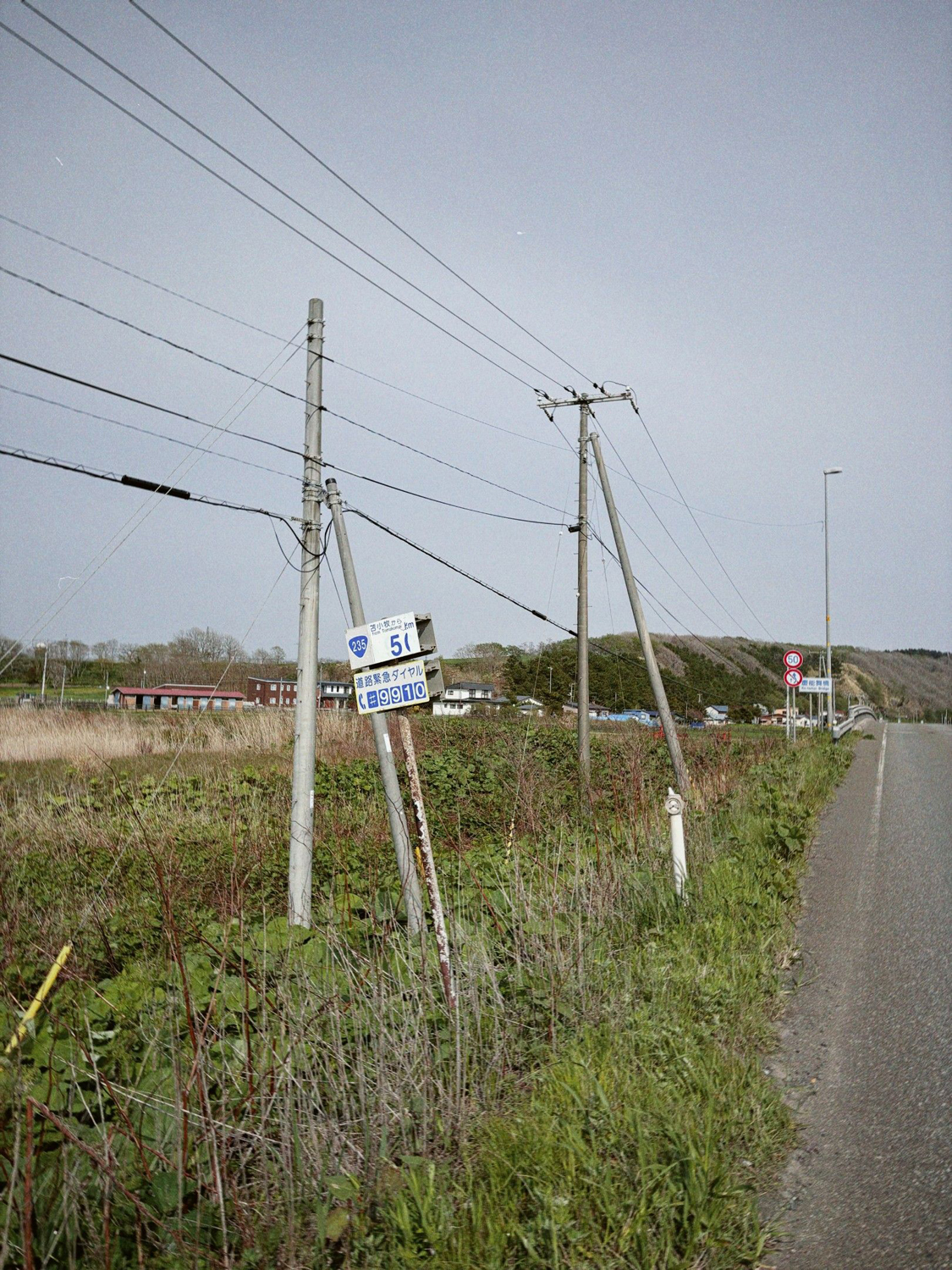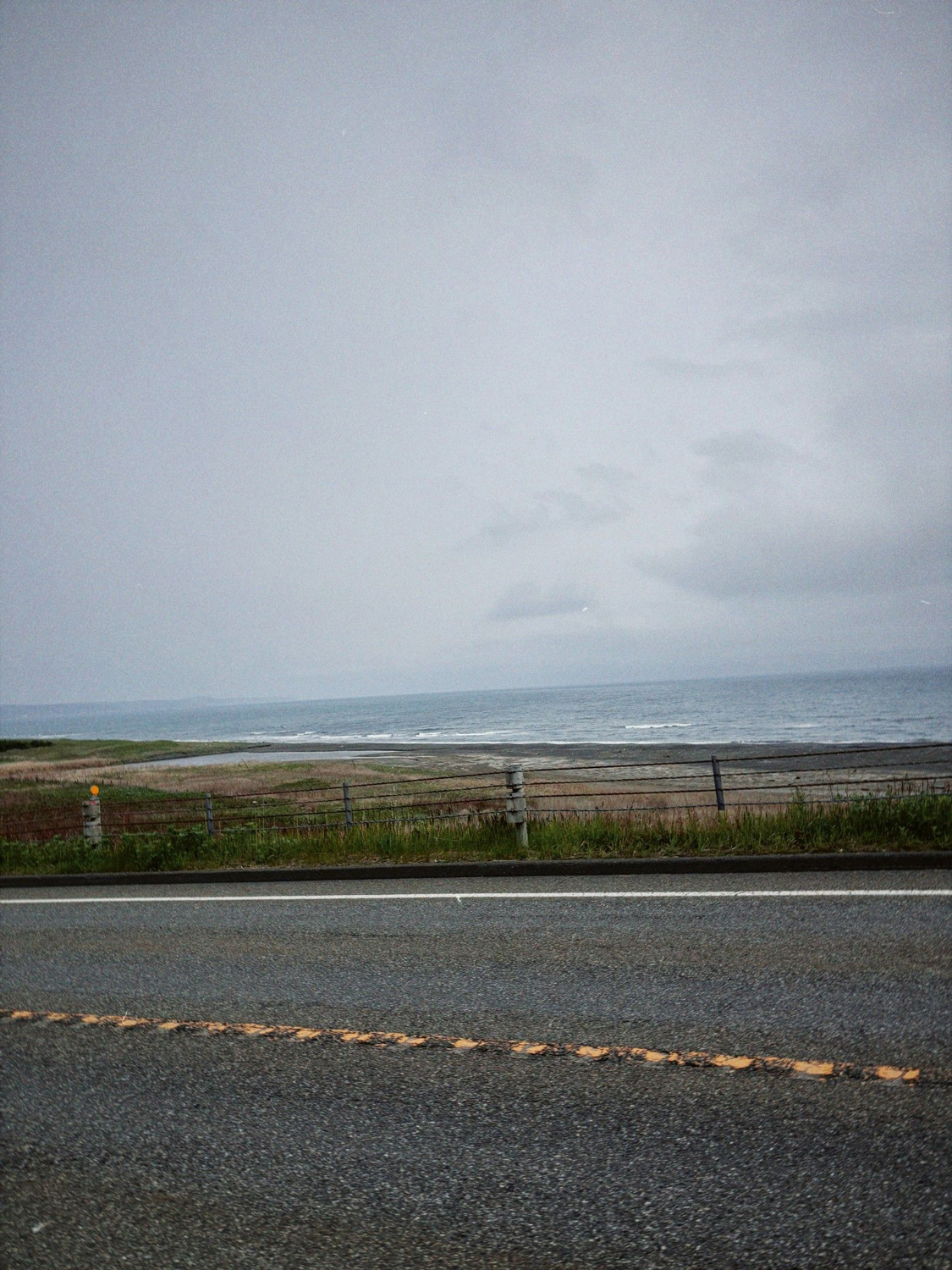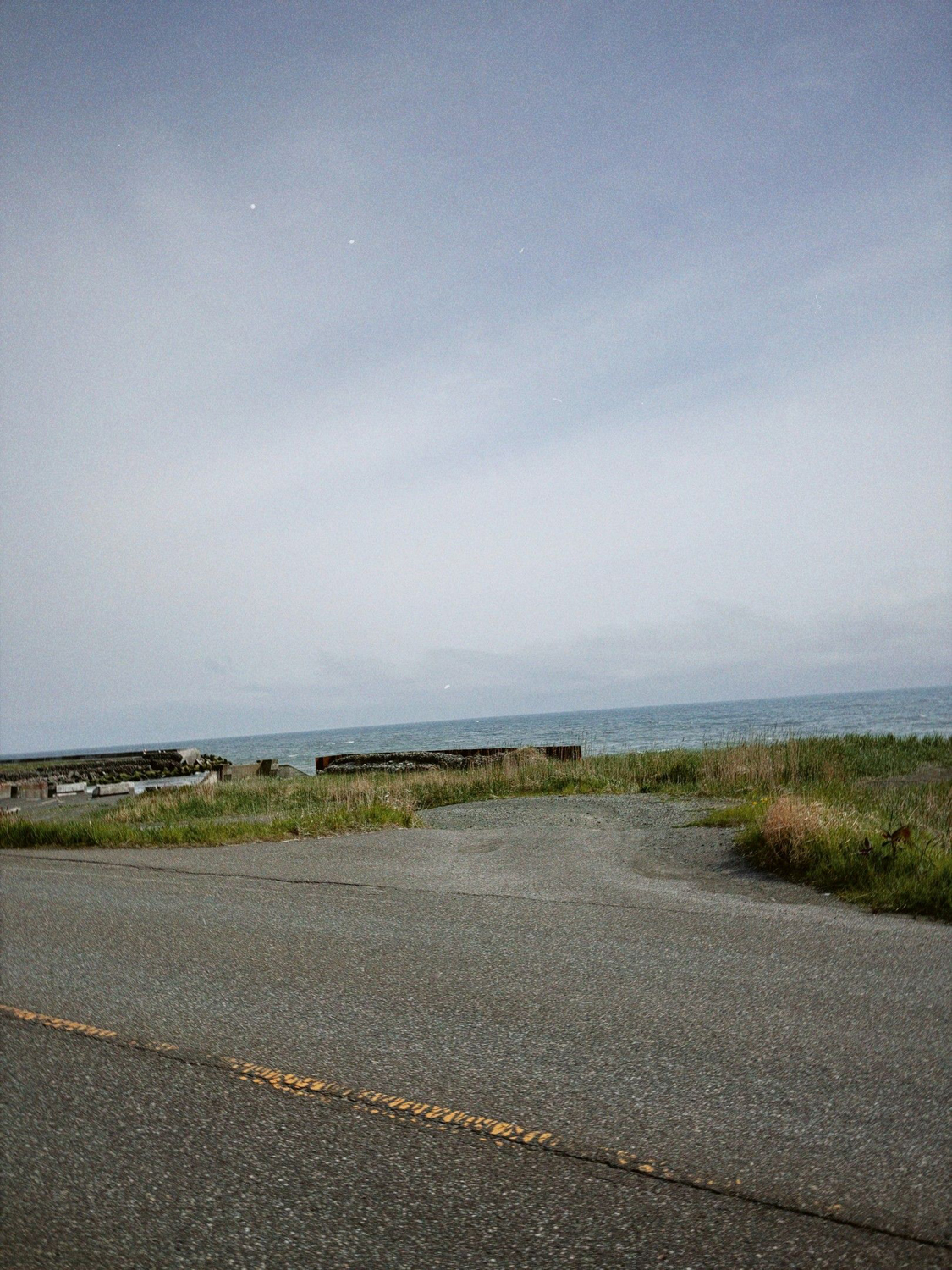 出発。また海が出てきた。海岸に沿って続く道路が遠くまで続いている。人工物もないのでとても遠くにも感じるし、意外と近いような気もする。東京で言うとどこまで行くのかな、など考えては忘れ、ひたすら繰り返し進む。この道路は、苫小牧から何kmという看板が立っていてちょうど50kmを過ぎた。もう50kmなのか。まだ50kmなのかわからないが、うれしい。車で1時間程度の距離を、1日半使っている。