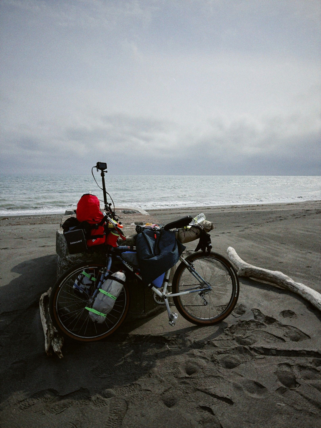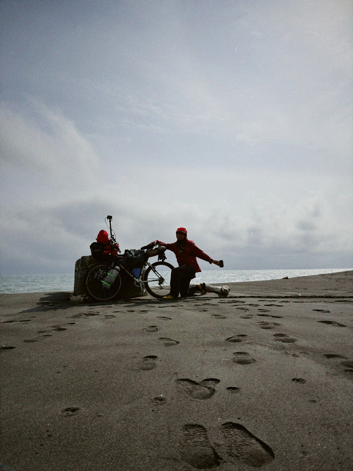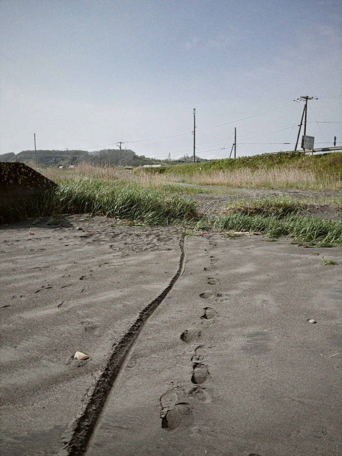 慶能舞川の手前、海に反れる道があったので息抜きに海に行くことにした。砂浜になっていたので、自転車を押して進む。振り返ると砂にできた足跡とタイヤの跡が並んでいた。仲良しの距離感のように見えてきて、優しい気持ちになった。寄り道してよかったな。