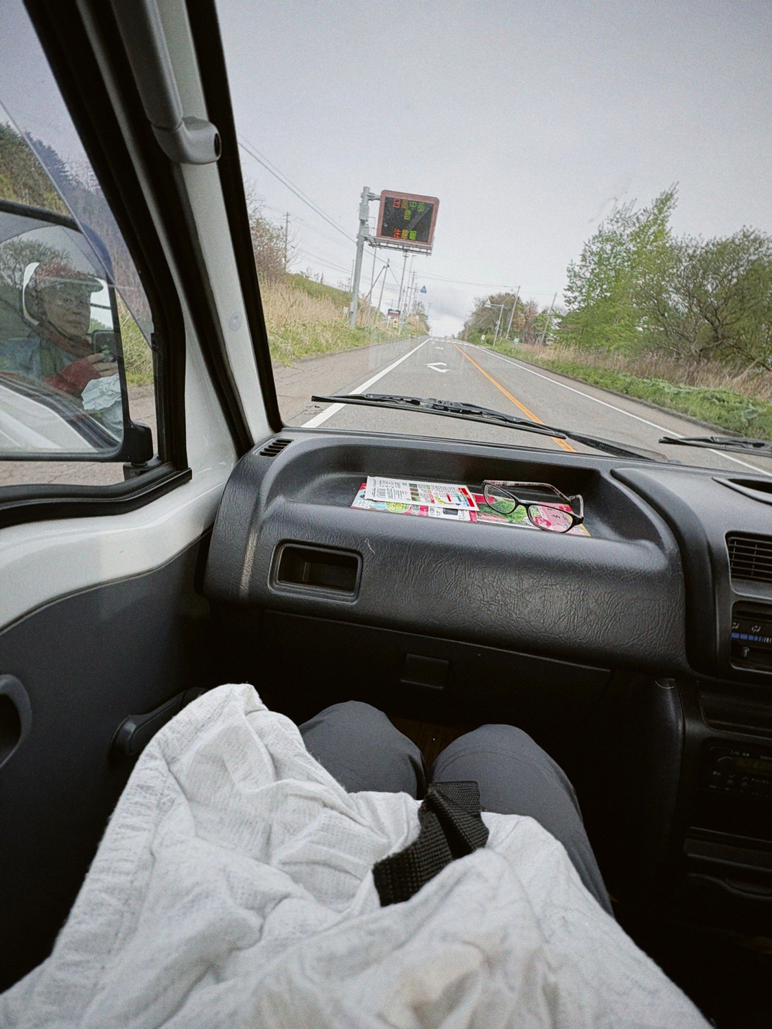 コーヒーをいただきながら旅の話をしていると、店主の奥さんと父親が帰ってきた。「どこからきた?」「どこまで行く?」「今日はどこに泊まる?」「うちはすぐそこにある」などと話していると、「この先、上り坂がきっと大変だから軽トラックでそこだけ送っていくよ」という話になって、流れるように自転車を車に乗せていた。「まあ、坂が終わる数百メートルだからね。」と言ったが、とたんに坂が終わったので、結局目的地の「新冠温泉レ・コードの湯」まで14kmも乗せてもらった。