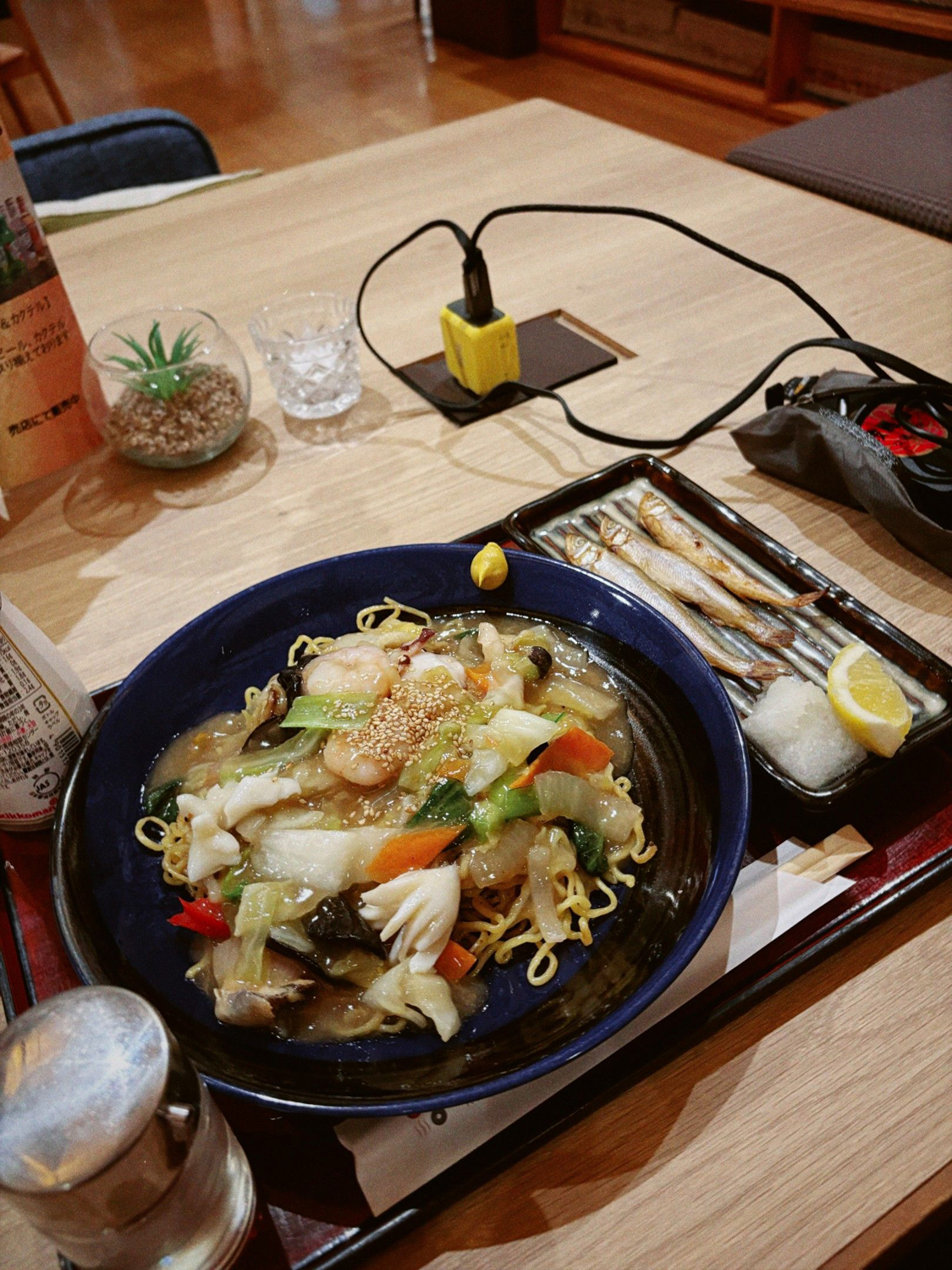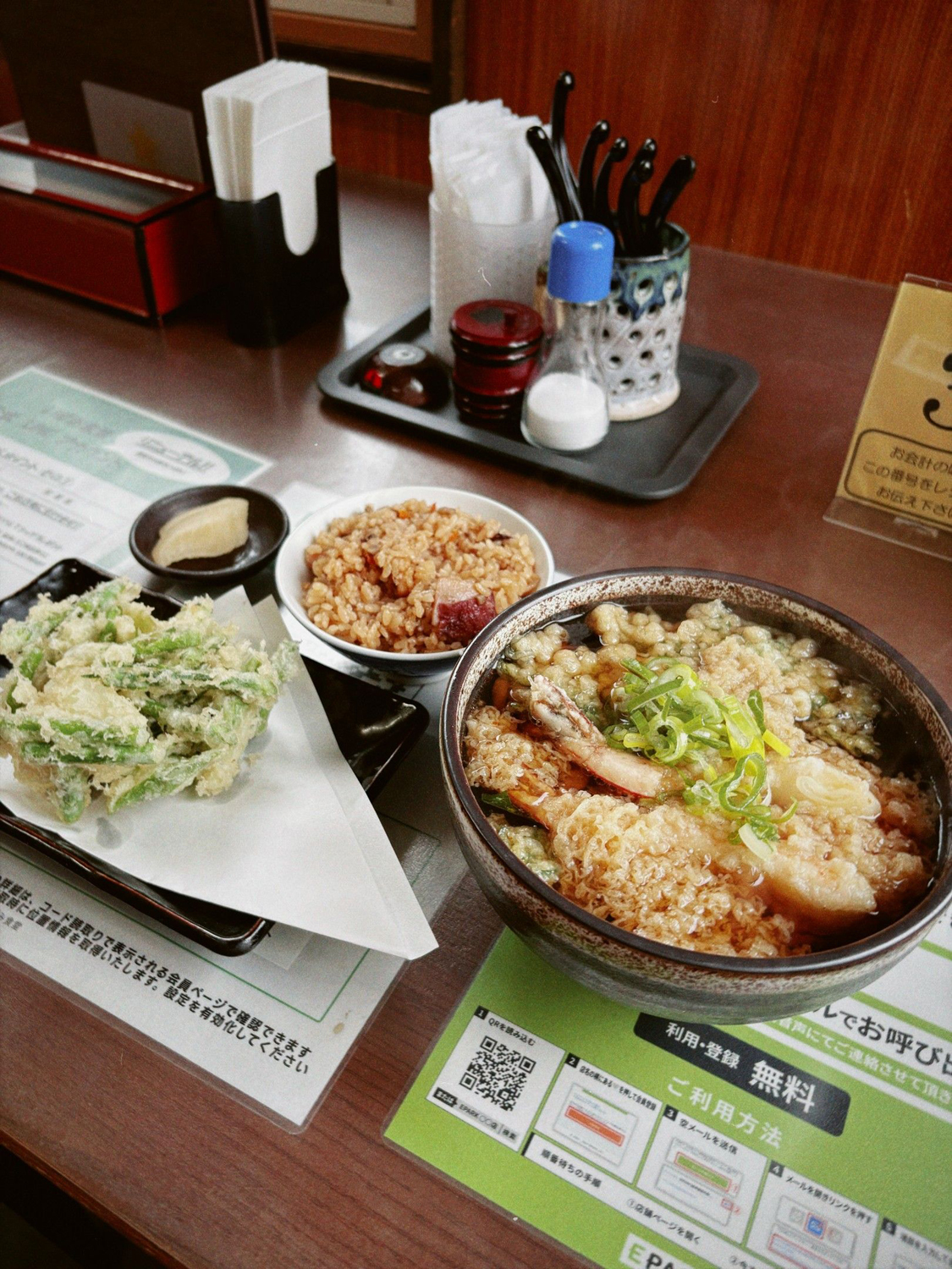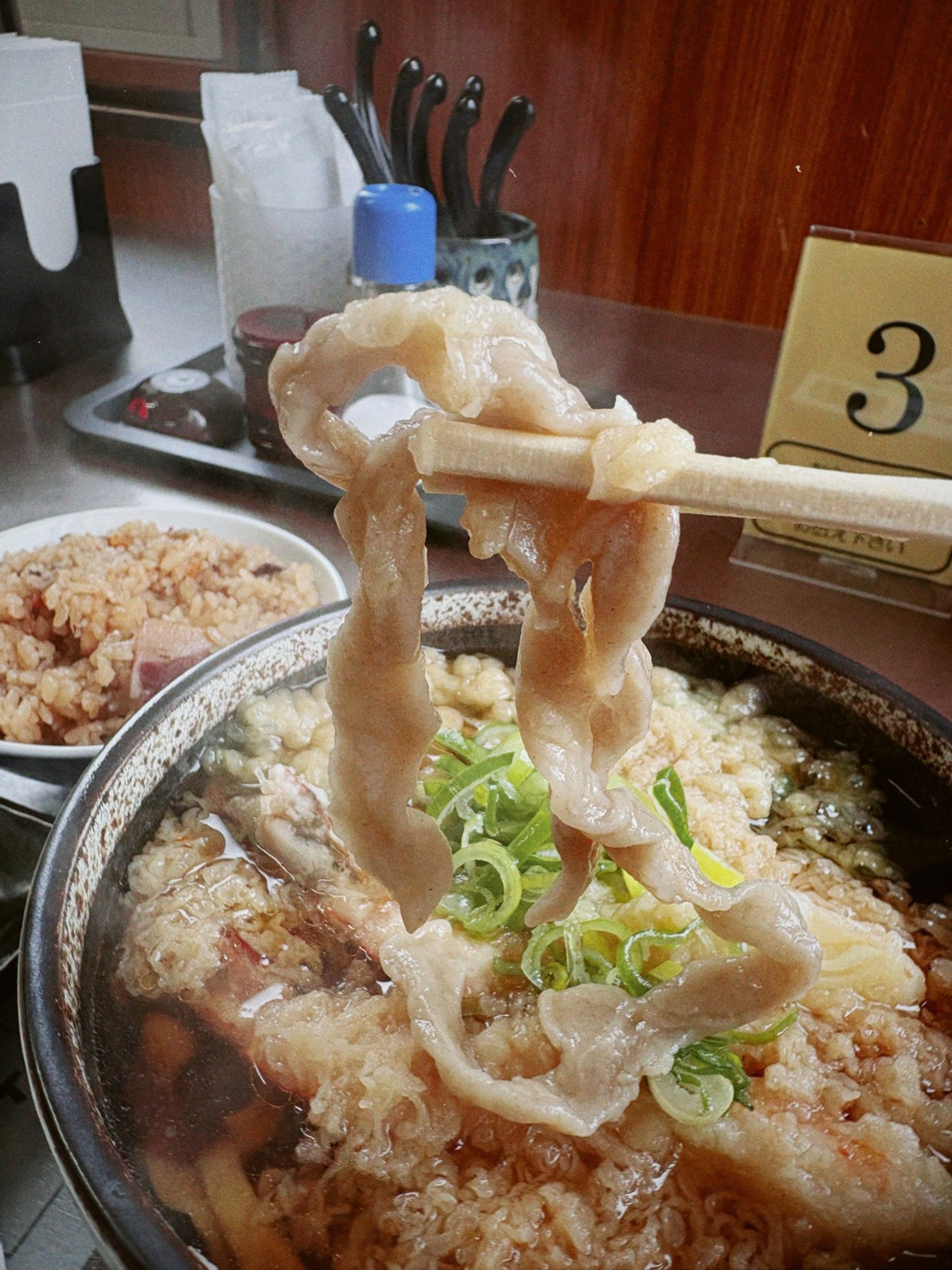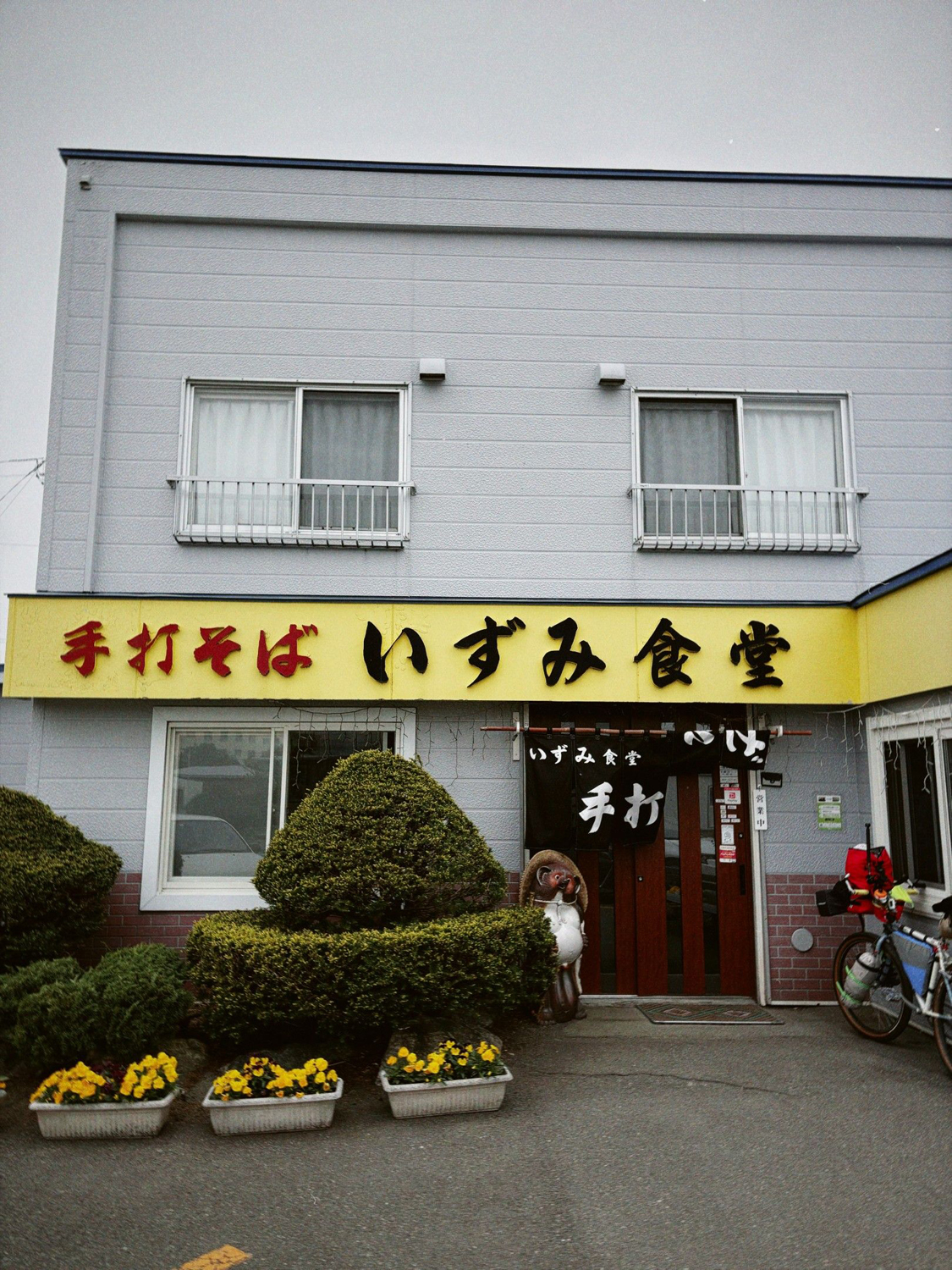 17km走ったところで「いずみ食堂」に到着。牧場の高村さんに事前に教えてもらった店。看板が見えて安心した。立ち寄らないとこの先また数時間、何もない。定食屋だと思っていたが、メニューを見るとそば屋だった。周りを見て、何を注文するか決める。天ぷらそばにタコ飯を注文。アスパラ天も頼んだら2人前くらいの食事がくる。頼みすぎたかもと思ったが食べられた。疲れてるのか、昆布がいいのか、体に沁みわたるような味だった。