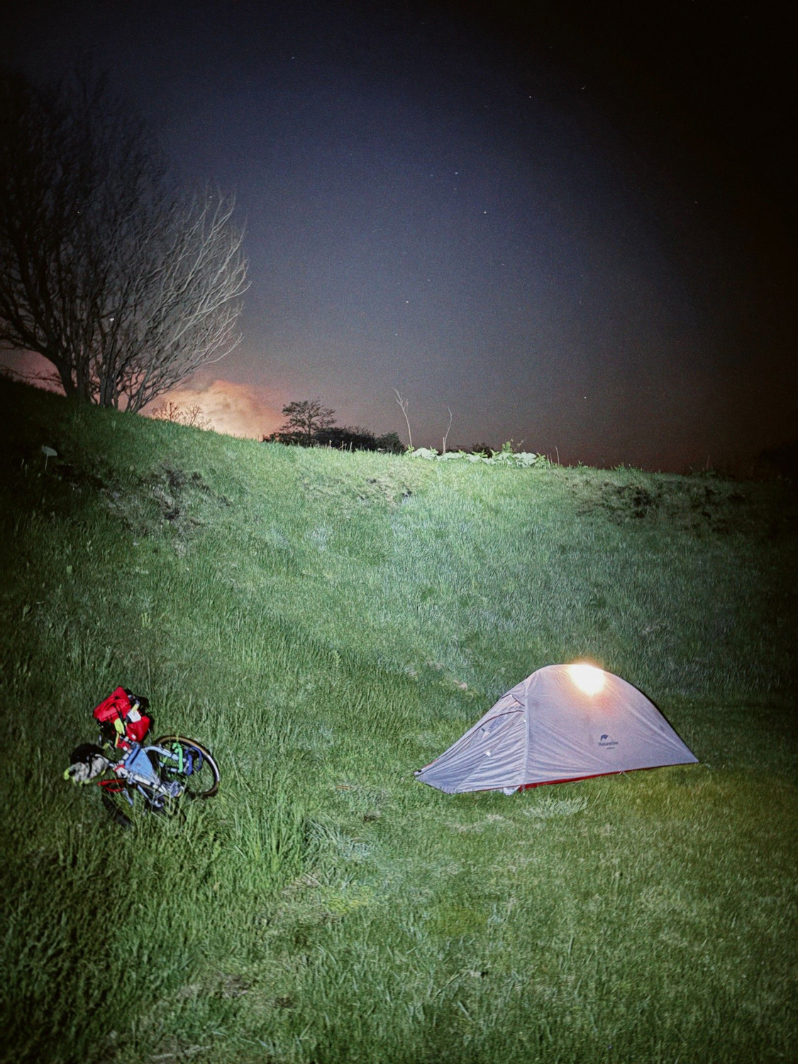 のんびりしていたら閉店まで過ごした。当然外は真っ暗で、野営地場所がみつからなかった。人通りがありそうだが平らな場所を見つけたので、テントを設置。食事は済ませていたので、今日はさっさと寝る。