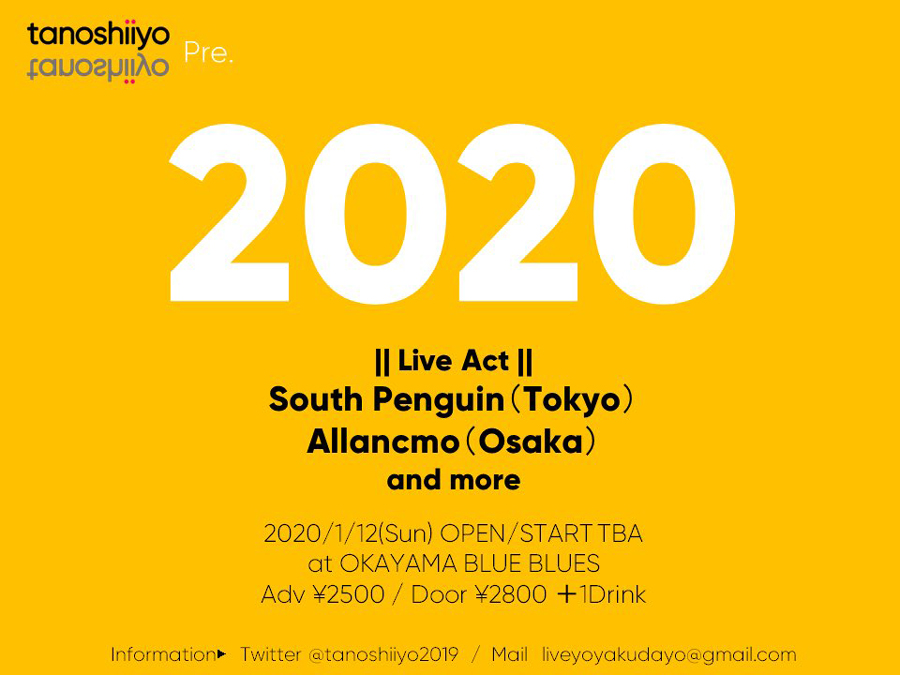 1月12日(日)は、岡山・BLUE BLUESにて開催のイベンター・tanoshiiyoが企画するイベント「tanoshiiyo pre.『2020』」への出演。フランスのトラック・メイカー・shogonodoのトラックで制作した1stアルバム『-20°C』を8月に発表した大阪のシンガー・ソングライターAllancmoらと共演します。