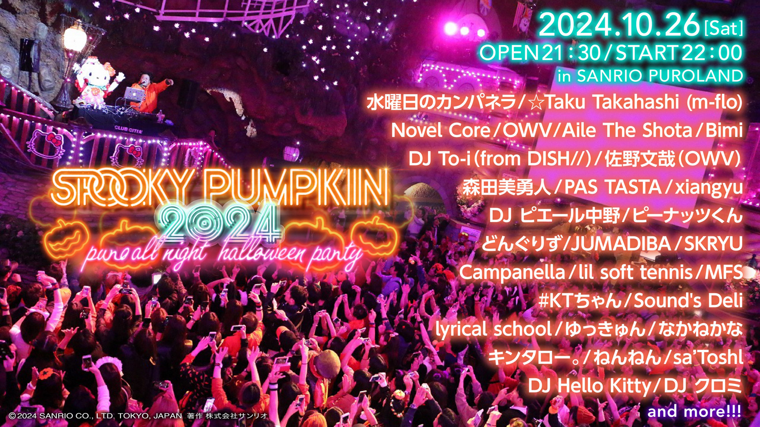 毎年ハロウィン・シーズンの風物詩となっている東京・多摩センター サンリオピューロランドでのナイト・パーティ「SPOOKY PUMPKIN」が、今年も10月26日(土)に開催決定。出演ラインナップ第1弾の発表と併せ、e+にてチケットの先行受付(抽選)が開始されています。