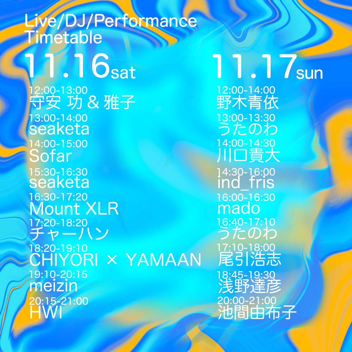 HWI (from Seoul, Korea) / Mount XLR (from Seoul, Korea) / CHIYORI × YAMAAN / 池間由布子 / 浅野達彦 / ind_fris / 尾引浩志 / うたのわ / 野木青依 / mado / 川口貴大 / seaketa / 守安 功 & 雅子 / チャーハン / meizin / Sofar