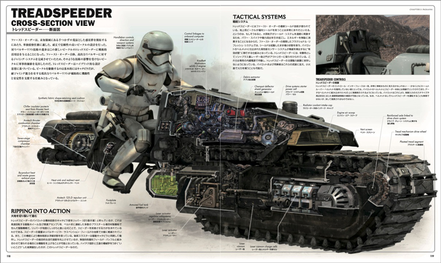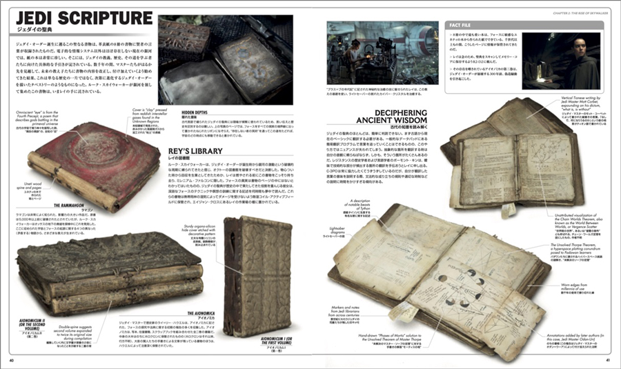 本書は、ルーカスフィルム“ストーリーグループ”のクリエイティブ・エグゼクティブを務めるパブロ・ヒダルゴが、初公開となる写真を多数使用しながら登場キャラクターやメカなどをB4判変型(25cm×30cm)の大判サイズで紹介。メカニックの内部を緻密に描いたクロスセクションや、銀河の歴史やキャラクターごとの個人史年表を掲載しているほか、初公開となる“秘密”も含め前2作『スター・ウォーズ / フォースの覚醒』『スター・ウォーズ / 最後のジェダイ』を解説。『スター・ウォーズ / スカイウォーカーの夜明け』製作中の貴重な舞台裏についても記述され、劇中では語られない戦闘機、武器、小物、衣装、などの細かな設定や名称、無名キャラクターや舞台裏エピソード、シーンに隠された場面設定、過去のストーリーとの関連性なども写真付きで掲載しています。