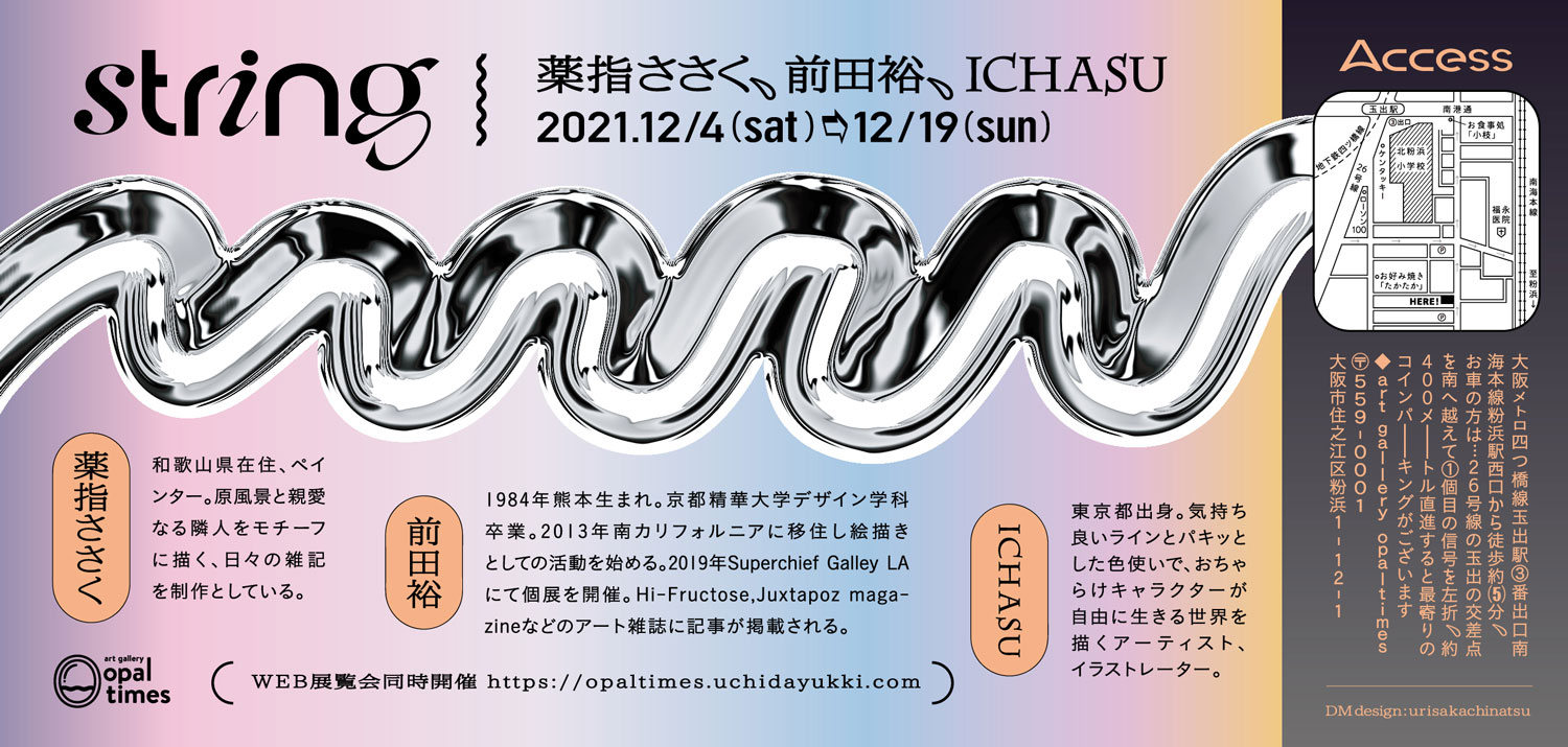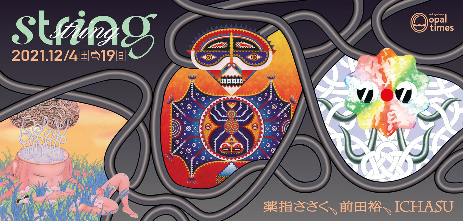 大阪・粉浜 art gallery opaltimesが、1月から3月まで三越伊勢丹オンラインストアにて個展「MOON」を開催したイラストレーター・ICHASU、10月に東京・外神田 3331 Arts Chiyodaで開催された企画展「WAVE TOKYO 2021」に参加したペインター・薬指ささく、10月に東京・四谷三丁目 清アートスペースにて開催されたグループ展「ynamics+」に参加したペインター・前田 裕を招き、3人展「string」を12月4日(土)から19日(日)まで開催。