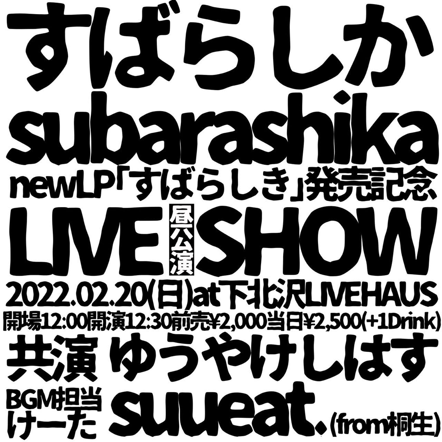 メンバー・チェンジを経て、新たにギタリスト・渡会悠人を迎えた編制で制作された同作は、録音を馬場友美、マスタリングを橋本竜樹が担当。2月20日(日)に東京・下北沢 LIVEHAUSにて開催される発売記念イベント「すばらしか『すばらしき』発売記念 LIVE SHOW」にはすばらしかに加え、元メンバー・林 祐輔によるソロ・プロジェクト“ゆうやけしはす”と、群馬・桐生を中心に活動するsuueat.が出演します。