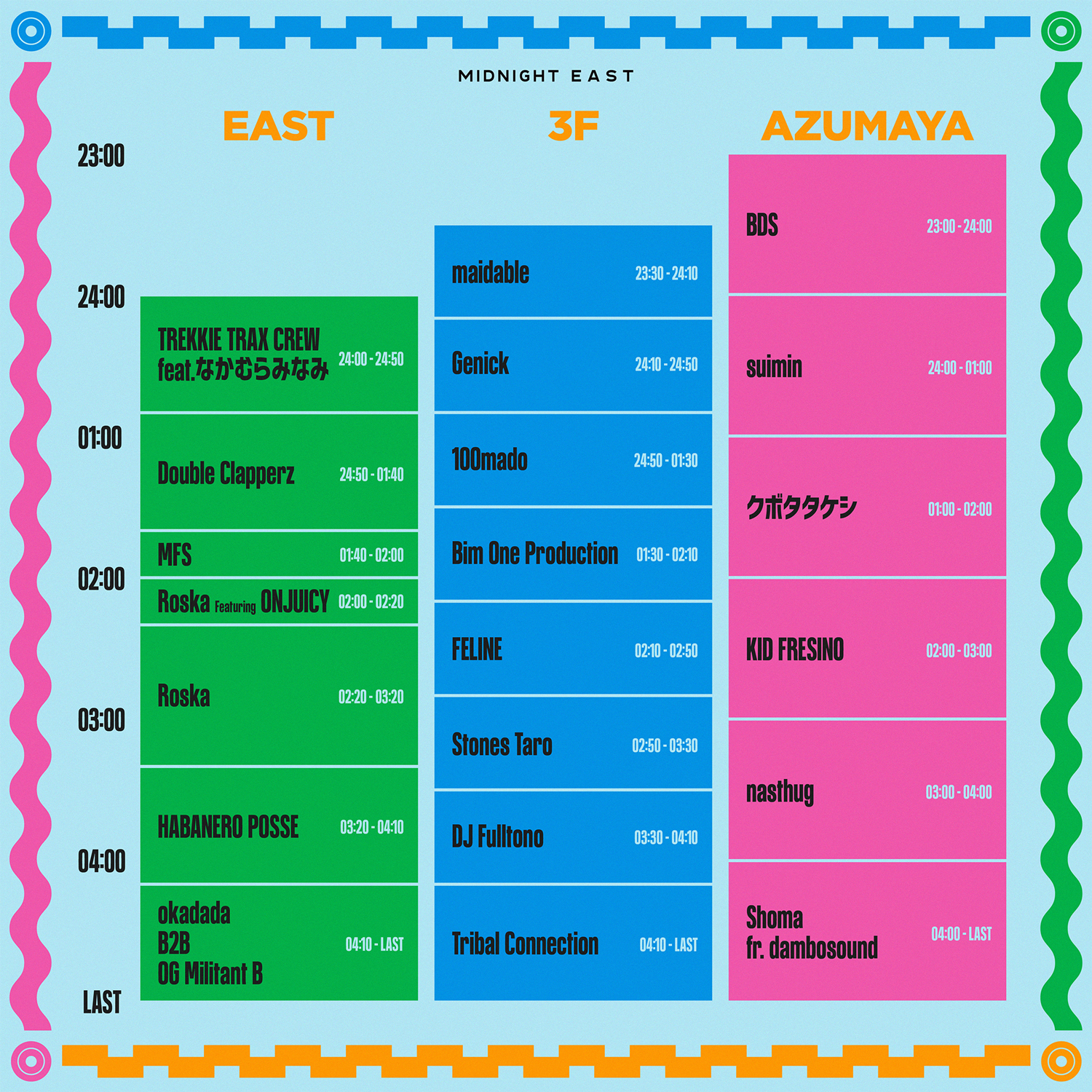 「eastaudio soundsystem」が導入されるO-EAST 3Fでは、「NC4K」を主宰するStones Taro、Bim One Production、DJ Fulltono、FELINE、Genick、maidable、Tribal Connection、100mado がスピン。東間屋では、BDS、KID FRESINO、クボタタケシ、nasthug、Shoma fr.dambosound、suiminによるDJが予定されています。