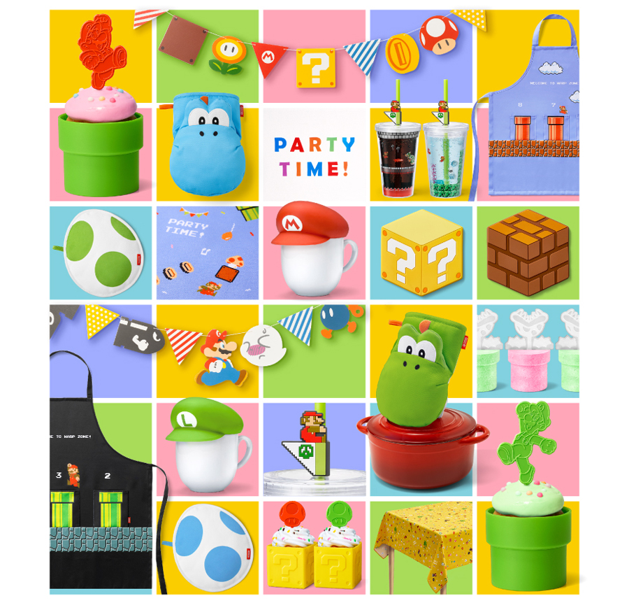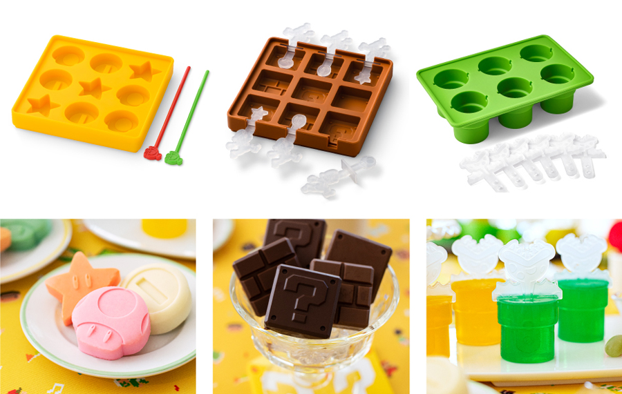 『マフィンカップ & ピック』は、土管型のマフィンカップ4個とマリオ型ピック2本、ルイージ型ピック2本のセットと、ハテナブロック型のマフィンカップ4個とスーパーキノコ型ピック2本、1UPキノコ型ピック2本のセットの2種。『シリコントレーセット』は、アイテム型のシリコントレーと赤とプクプク(緑)のマドラーのセット、ブロック型のシリコントレーとマリオのスティック6本のセット、土管型のシリコントレーと土管から出現するパックンフラワーをモチーフにしたスティックが6本付属するセットの3種。