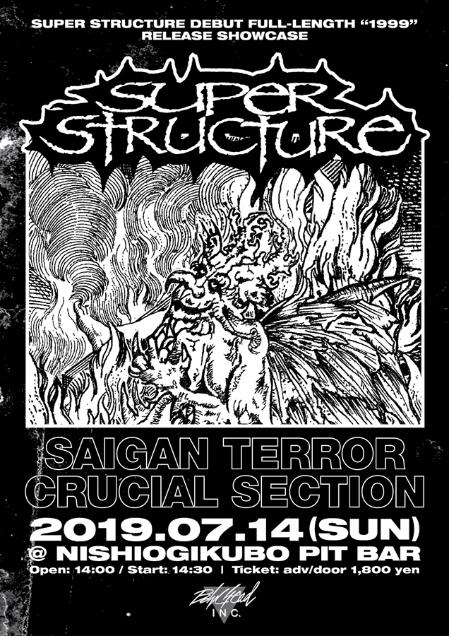 CONFIND、CRYSTAL LAKE、DIVISION、ERIC、EVE OF THE APOCALYPSE、EVERLAST、EXTINGUISH THE FIRE、UNBOYで活躍した国産ニュースクール・ジャスティスなラインナップながら、パワーヴァイオレンスに通じるロウなサウンドとブルータルなライヴ・パフォーマンスでリージョン・フリーに注目を浴びる東京ハードコア・SUPER STRUCTUREが、2作のデモ『1997』(2014)、『1998』(2016)に続いていよいよフル・アルバム『1999』(CD BHI-033 2,000円 + 税)を7月20日(土)にBOWL HEAD inc.からリリース。発売に先駆け、収録曲「Despair」が公開されています。