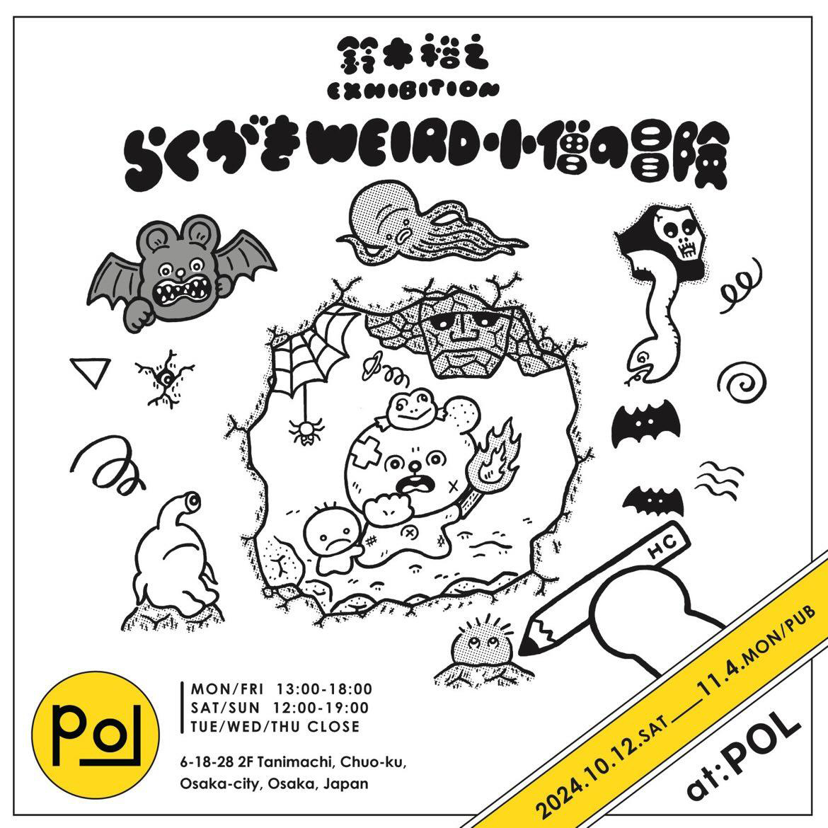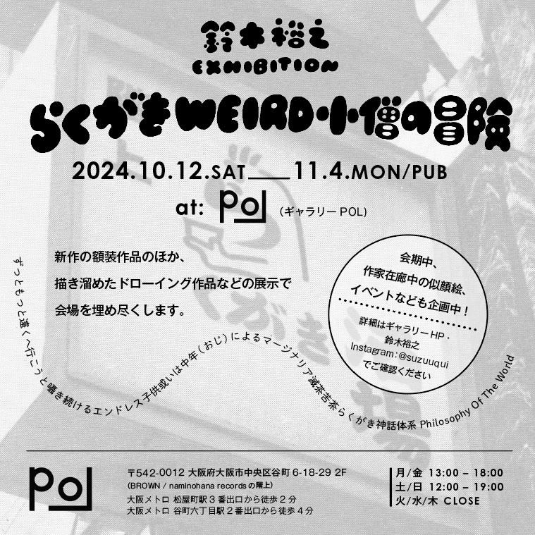8月から9月にかけて開催された個展「MARGINALIA滅茶苦茶」が好評を博したイラストレーター・鈴木裕之が、続く個展「らくがきWEIRD小僧の冒険」を10月12日(土)から11月4日(月・祝)まで大阪・谷町六丁目 POLにて開催。