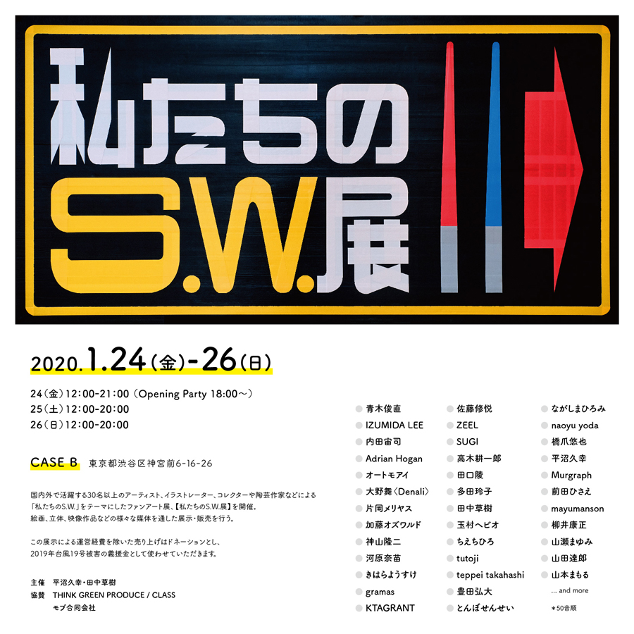 国内外で活躍する30名以上のイラストレーター、陶芸作家やコレクターなどによるファン・アート展「私たちのS.W.展」が1月24日(金)から1月26日(日)まで東京・神宮前 CASE Bで開催されます。