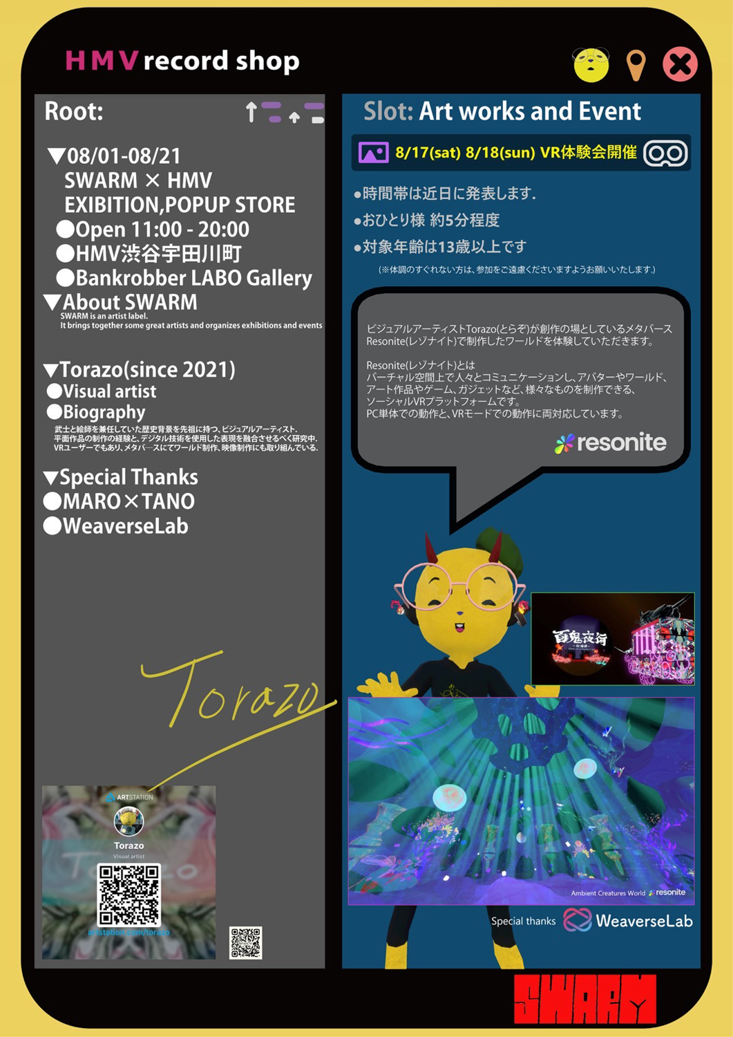 イラストレーター、3Dモデラーらが所属するクリエイターズ・コレクティヴ「SWARM」が、「HMV」とコラボレートしたエキシビション / ポップアップ・ストアを8月1日(木)から21日(水)にかけて東京・渋谷 Bankrobber LABO(HMV record shop 渋谷)にて開催。