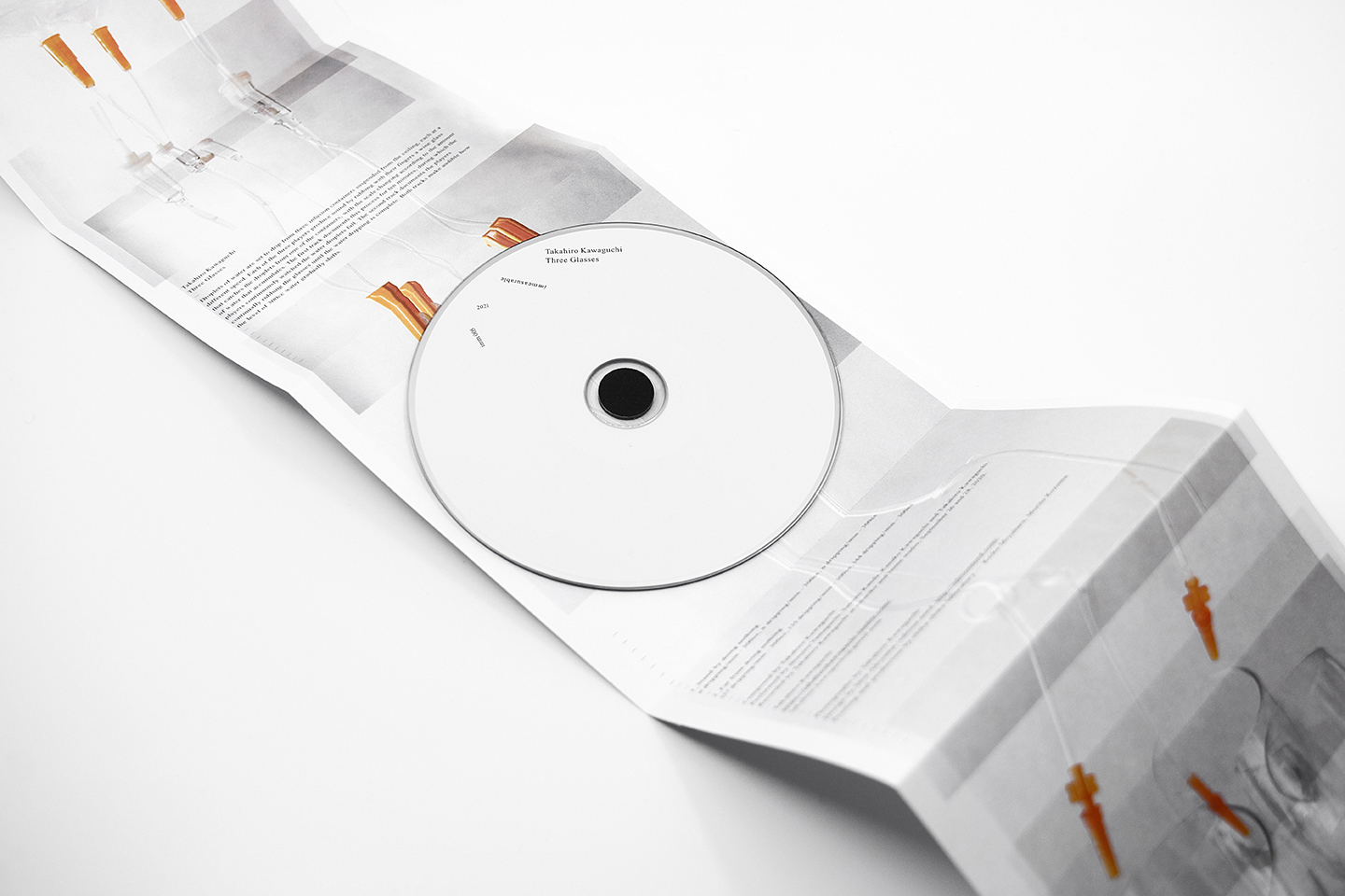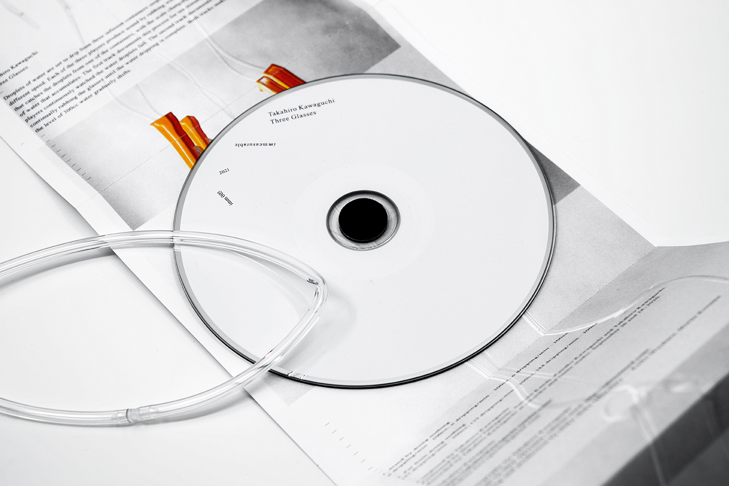 同作は、天井に吊るされた点滴から滴下するグラス3脚を、グラスハープの要領で演奏する様子を捉えたもの。3脚それぞれに異なる設定の滴下数を“譜面”に演奏を続け、最終的にピッチが合うまでをコンセプトに制作された“作曲作品”となっています。奏者は、川口率いるバンド“Hello”のメンバーでもある神田 聡、山口晋似郎と、川口自身を含む4名。パッケージの装丁 / デザインは秋山 伸(edition.nord)が手がけています。