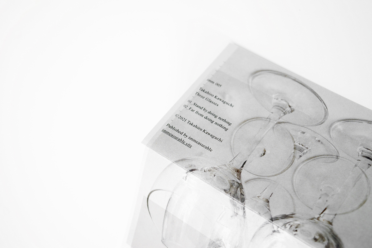 カスタム・デヴァイスを用いるスタイルで、ソロやNick Hoffman、Tim Olive、宇波 拓、Utah Kawasakiらとのコラボレーション、大城 真、矢代諭史と組んだ“夏の大△”などで活動する演奏家してのみならず、電影と少年CQ、少女閣下のインターナショナルらのコンポーザーとしても知られる川口貴大が、新作音源『Three Glasses』を「immeasurable」からリリース。3月5日(金)よりBandcampにて300部限定フィジカル・パッケージ(CD imm-005 税込・送料込1,870円)の販売が開始されます。