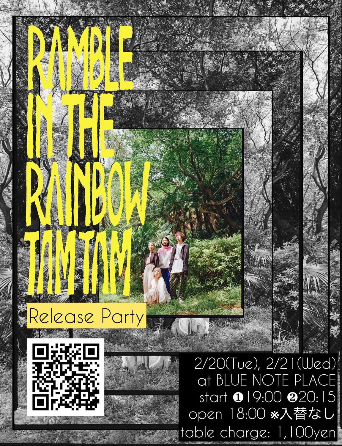 昨年はドラマー・高橋アフィがForever Lucky名義で発表したビートテープ『Recollection Of Drum』や、かねてよりソロでも精力的に活動するシンガー / トランぺッター / シンセサイザー奏者・Kuroの最新シングル『Coco』も話題となったTAMTAMが、再録アルバム『We Are the Sun! Home Edition』(2021)を挟み、『We Are the Sun!』(2020)以来約4年ぶりのオリジナル新作『Ramble In The Rainbow』を1月に鶴岡 龍やWool & The Pantsの作品でもおなじみの米ワシントンDC「Peoples Potential Unlimited(PPU)」からリリース。同作のリリース・パーティが2月20日(火)、21日(水)の2日間に亘って東京・恵比寿 BLUE NOTE PLACEにて開催されます。