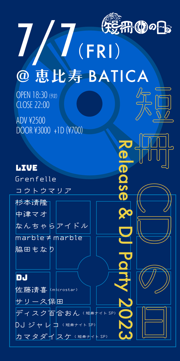 企画当日の7月7日(金)には、東京・恵比寿 BATICAにて「短冊CDの日 Release & DJ Party 2023」を開催。杉本清隆、中津マオ、marble≠marble、コウトウマリア、脇田もなり、なんちゃらアイドルらのライヴ・パフォーマンス、ディスク百合おん(短冊ナイトSP)、DJジャレコ(短冊ナイトSP)、カマタダイスケ(短冊ナイトSP)、サリー久保田、佐藤清喜(microstar)によるDJが予定されています。また、東京・渋谷 HMV record shop 渋谷では、7月10日(月)から16(日)までの1週間に亘り「短冊CDの日 SPECIAL WEEK 1週間連続インストア祭」と題して連日ニ・ライヴ + 特典会を開催。赤帽さん(まゆたん + 内田俊輔)、ayU tokiO、小日向由衣、marble≠marble、WAY WAVE + 絶対忘れるななどの出演が決定しています。