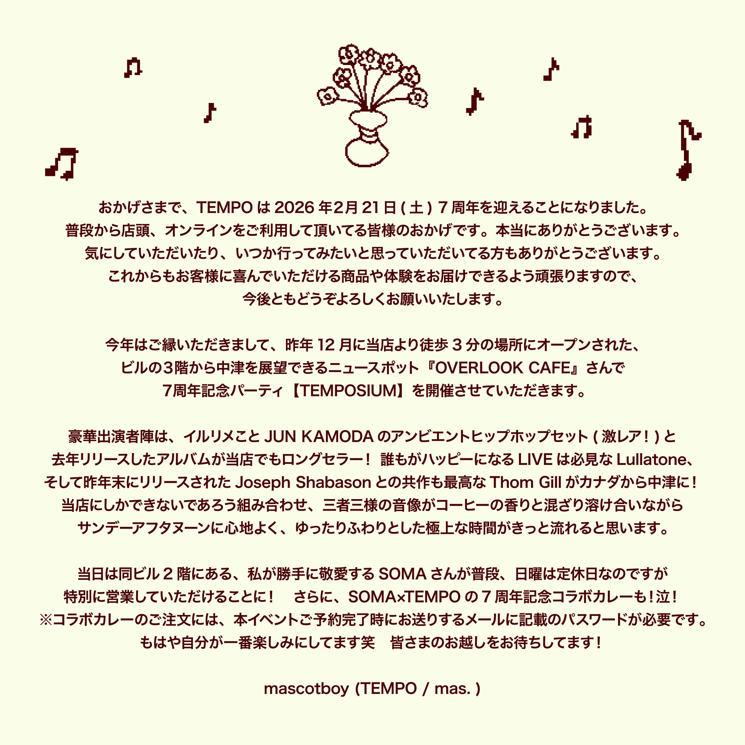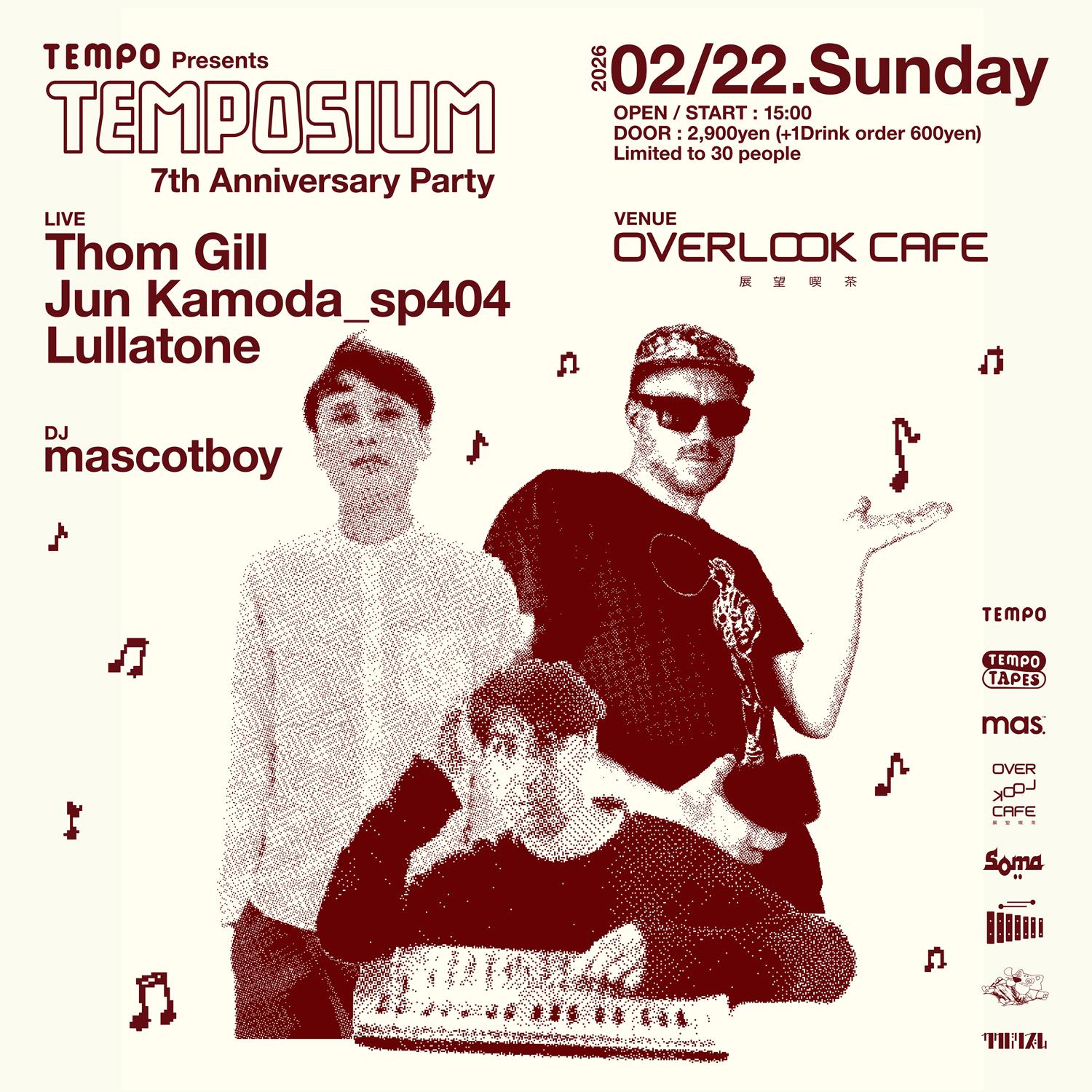 なお当日は、同ビル2Fのカレー・ショップ「SOMA」が通常は日曜定休のところ特別に営業。TEMPOの7周年を記念したコラボレーション・カレーがメニューに加わります(注文には予約完了時に送付されるメールに記載されたパスワードが必要)。