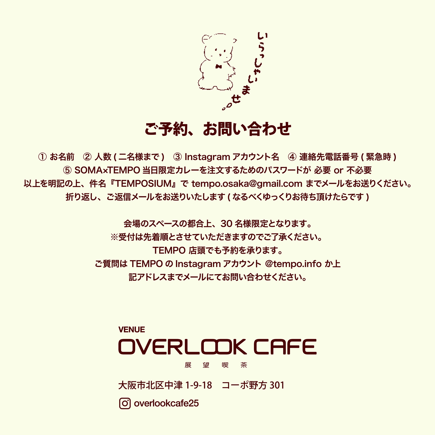 件名に「TEMPOSIUM」、本文に「お名前 / 人数(2名様まで) / Instagramアカウント名 / 連絡先電話番号(緊急時) / SOMA × TEMPO当日限定カレーを注文するためのパスワードが必要 or 不必要」を明記してメールをお送り下さい。手続きが済み次第予約完了のメールを返信いたします。