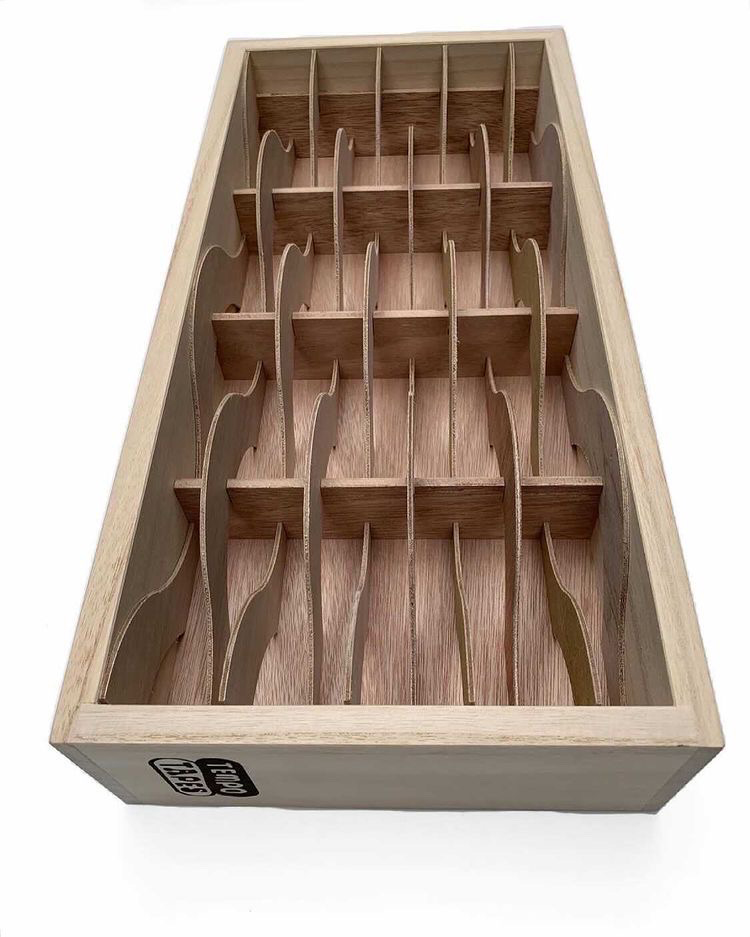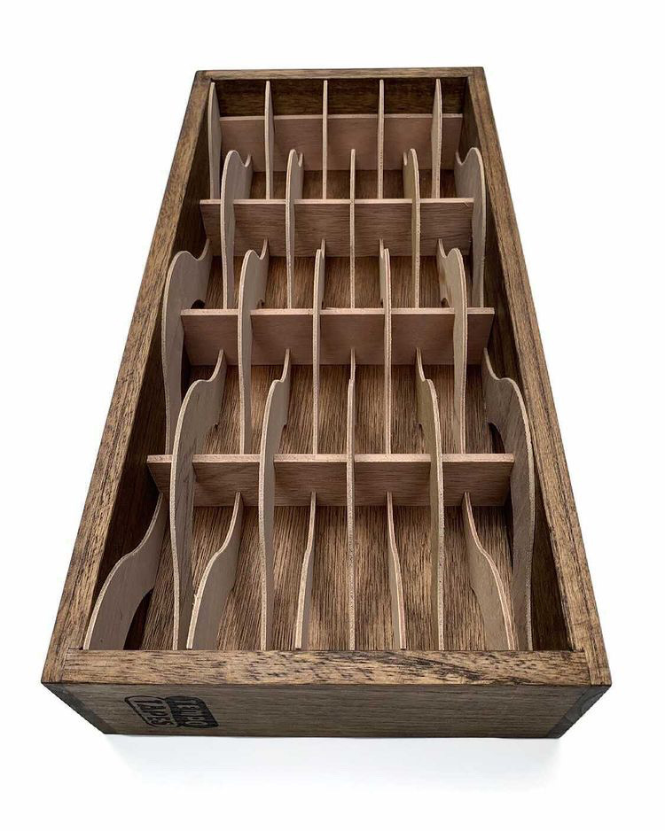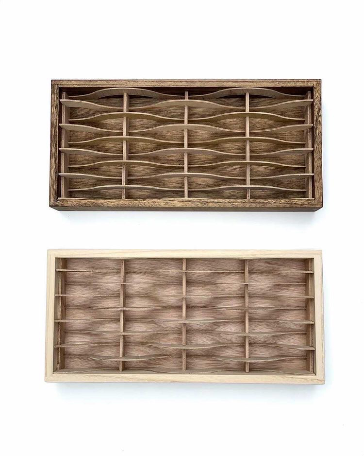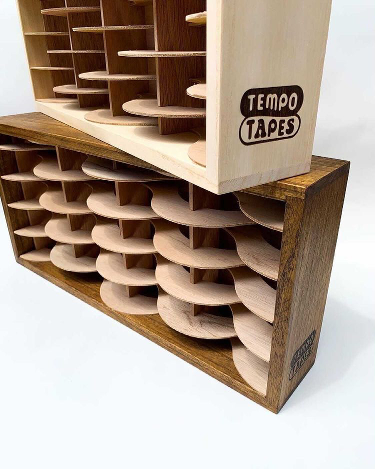 併せて、雲や水の流れをイメージして仕切り部分を波状に設計したというテープ・ラック『漂(TADAYOU)』も店舗にて販売(オンライン販売なし)。愛知・名古屋の木工会社「DaLa mokko」に制作を依頼した同商品は、無塗装の「MUKU」とダークチョコレート色のニスを塗った「DARK CHOCOLATE」の2色展開。井口弘史がデザインした「TEMPO TAPES」のロゴが焼印であしらわれています。