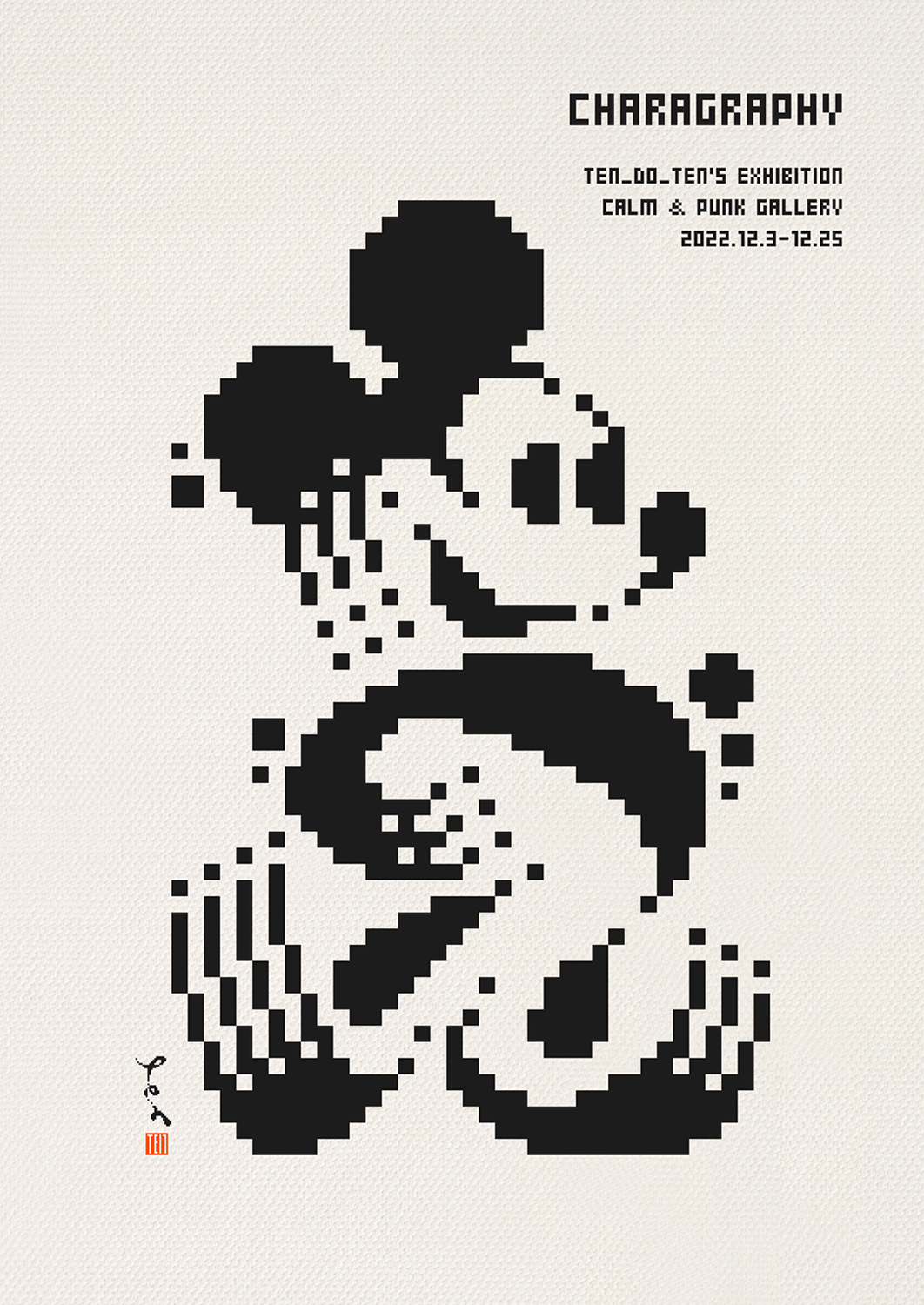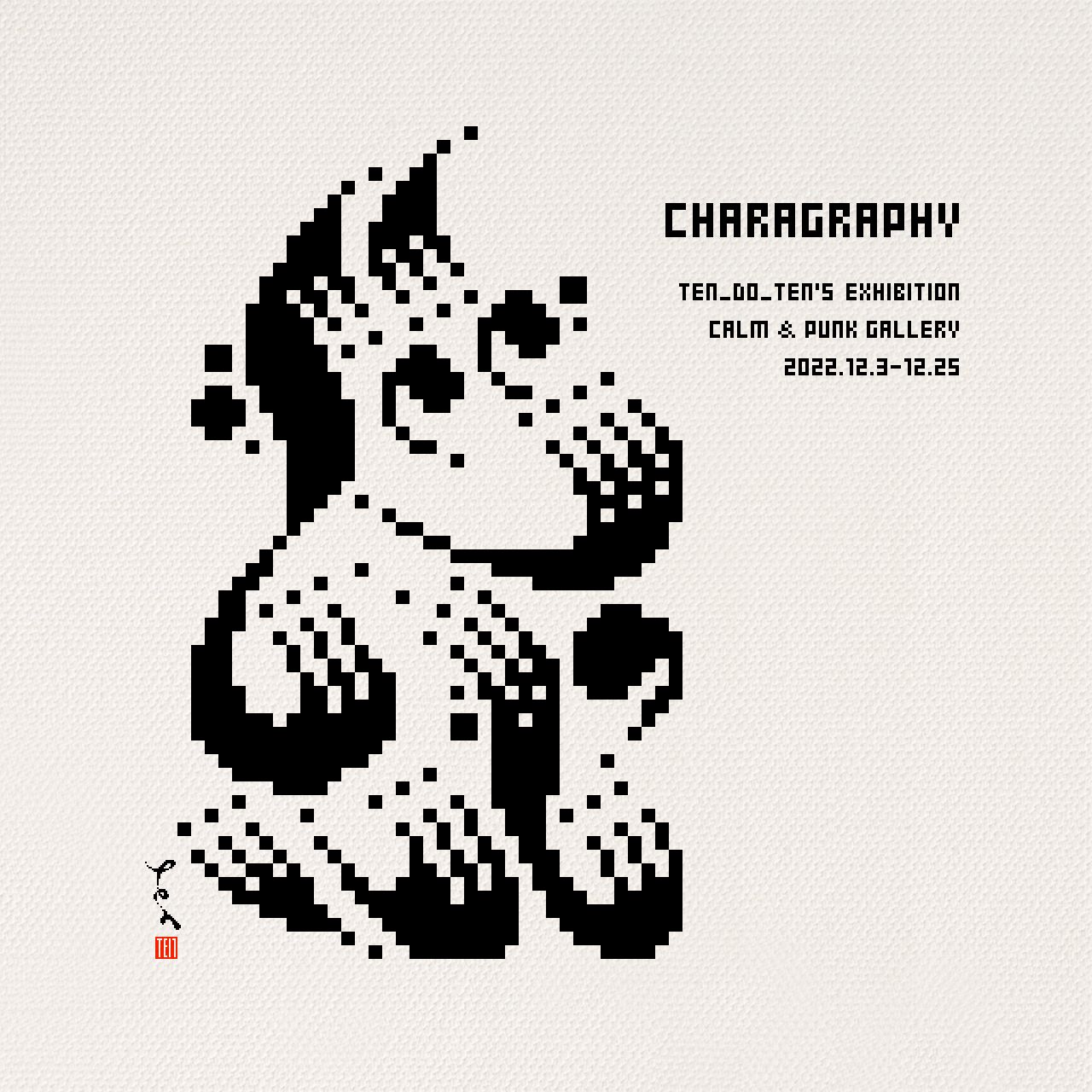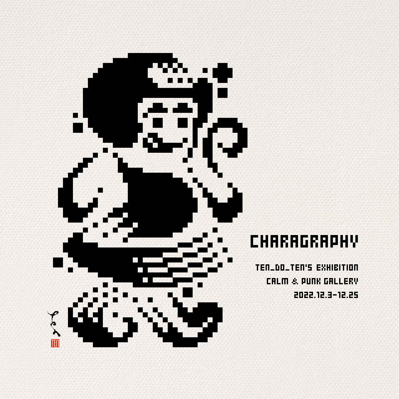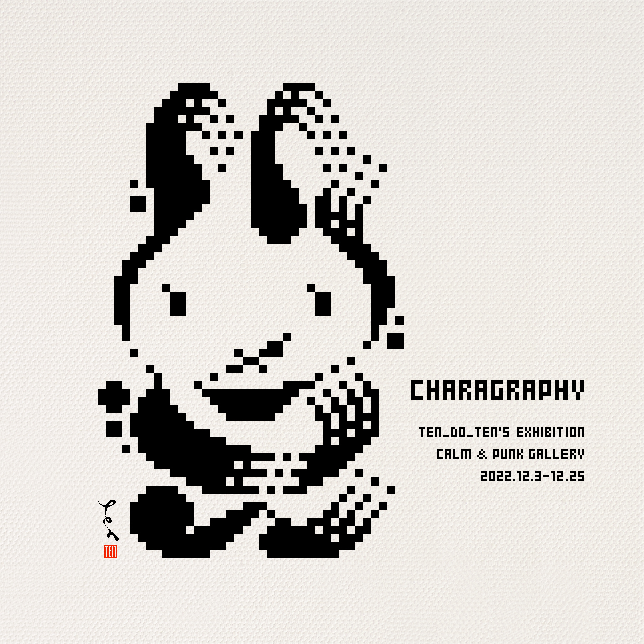 これまでに2万3000点を超えるピクセル・アート作品を制作しているten_do_tenは、2000年にスタートした立花ハジメプロデュースのiモード公式チャンネル「The END」にて横尾忠則やShepard Fairey aka Obey Giantらと共にモバイル・グラフィックを発表。2001年12月にはウェブサイト「ten_do」をローンチし、ピクセル・グラフィックをオンラインで公開しています。CALM & PUNK GALLERYには「ペイパ~バックな日々・678週」(2014)以来約8年ぶりの出展となる「CHARAGRAPHY」では、作家自身の思い入れが深いキャラクターをカリグラフィー(書道)のようにピクセル・デザインした新作68点を展示販売。