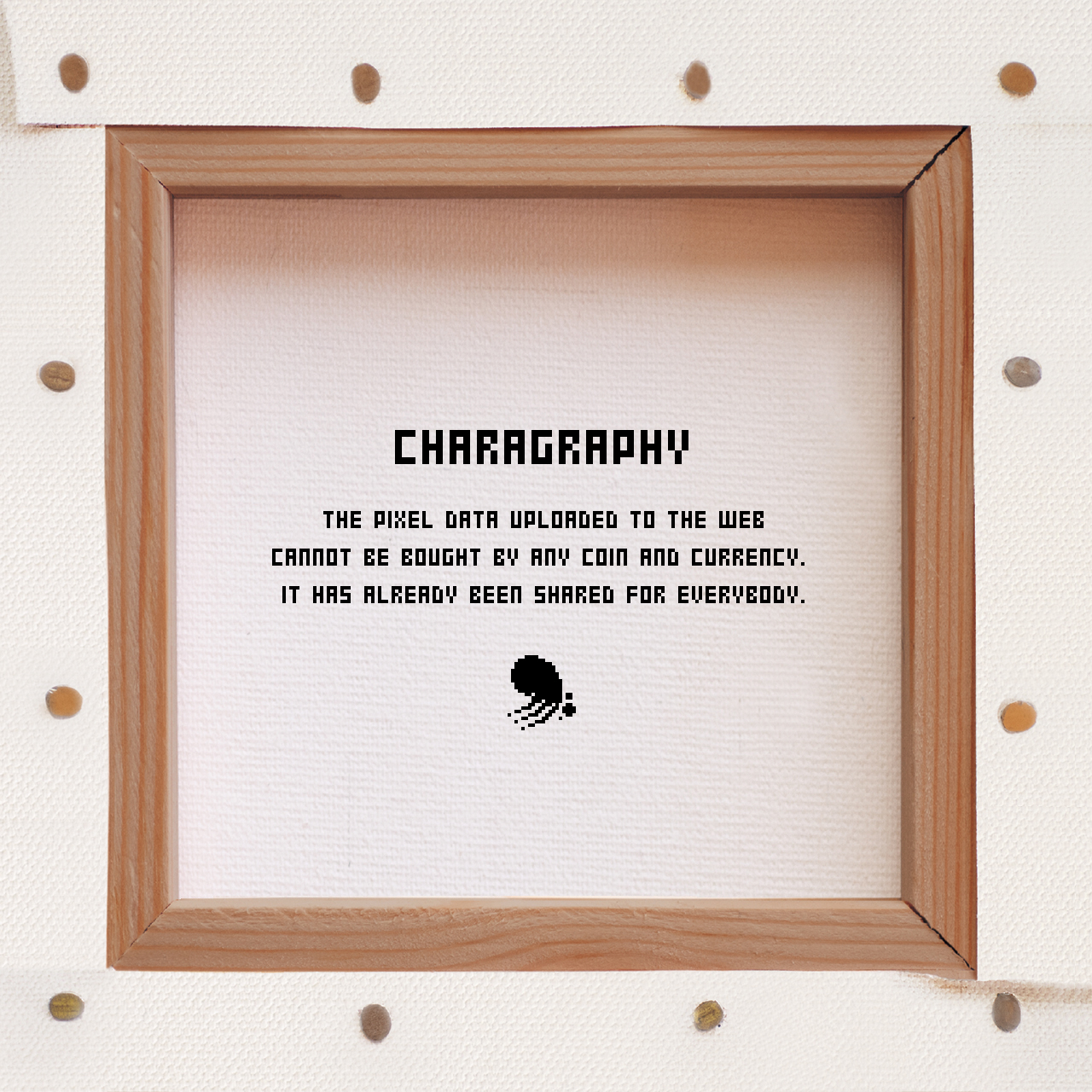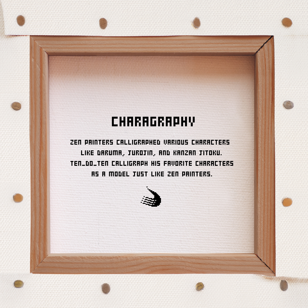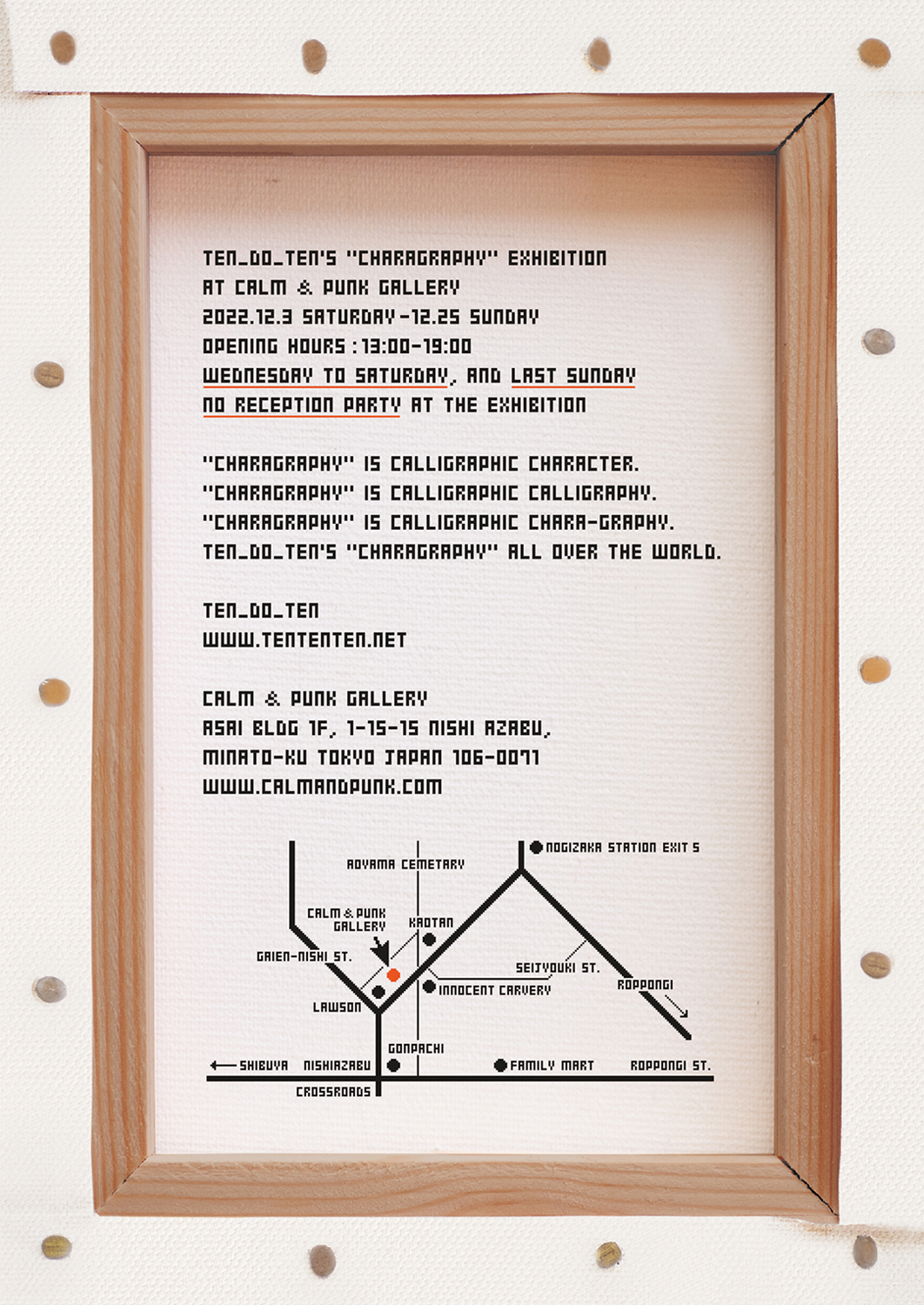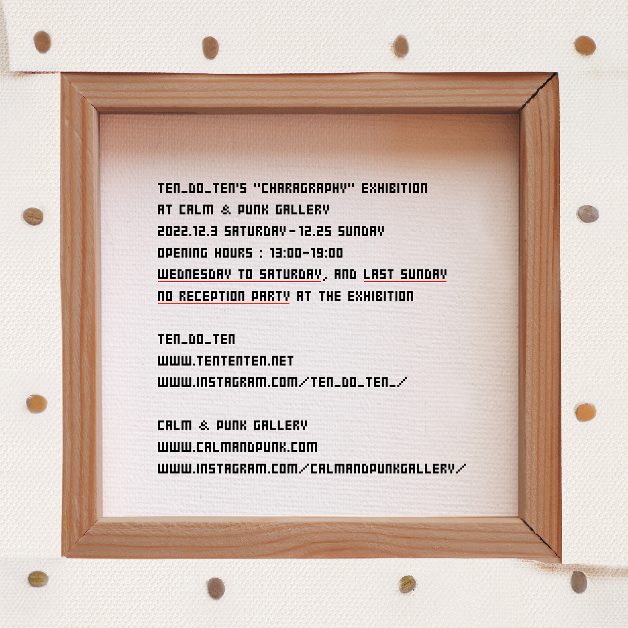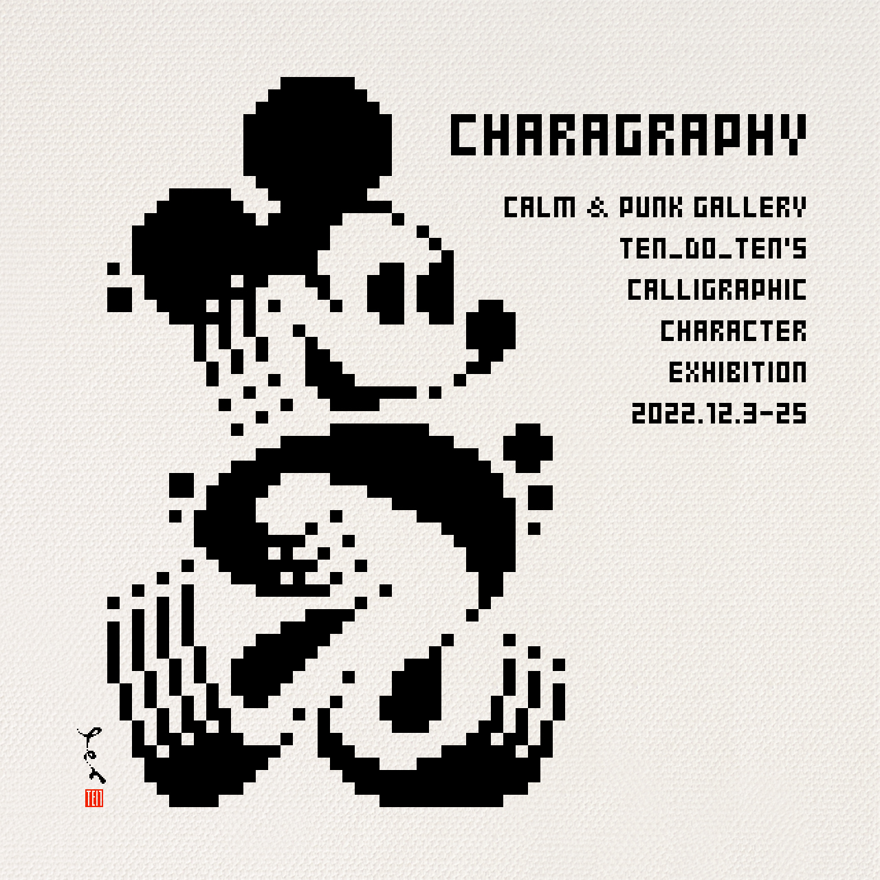 これまでに2万3000点を超えるピクセル・アート作品を制作しているten_do_tenは、2000年にスタートした立花ハジメプロデュースのiモード公式チャンネル「The END」にて横尾忠則やShepard Fairey aka Obey Giantらと共にモバイル・グラフィックを発表。2001年12月にはウェブサイト「ten_do」をローンチし、ピクセル・グラフィックをオンラインで公開しています。CALM & PUNK GALLERYには「ペイパ~バックな日々・678週」(2014)以来約8年ぶりの出展となる「CHARAGRAPHY」では、作家自身の思い入れが深いキャラクターをカリグラフィー(書道)のようにピクセル・デザインした新作68点を展示販売。