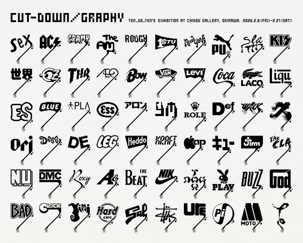 約1年前に沖縄へと移住したten_do_ten。那覇では初の個展となる「点のCUT-DOWN / GRAPHY展」では、自身の思い入れが深いロゴ・デザインを切りとって(カット)さらに引き算(ダウン)