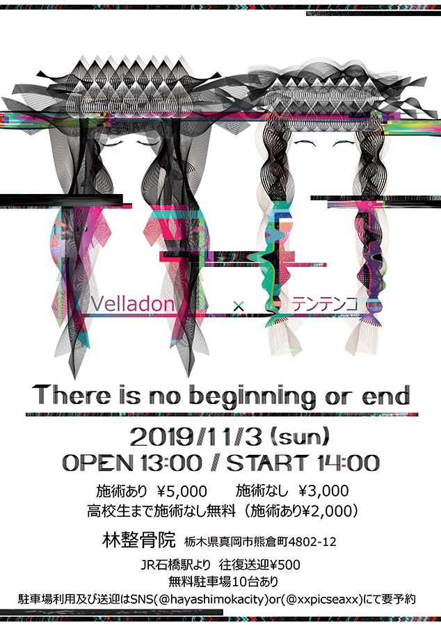 過去に栃木・宇都宮 HEAVEN’S ROCK VJ-2での音楽フェスティヴァル「林整骨院音楽祭」などを主催している「林整骨院」が、院内での施術と音楽のクロスオーヴァーを志向する「There is no beginning or end」。Velladon“テクノセット”とテンテンコの各ソロ・パフォーマンスに加え、コラボレーションでの演奏も予定されています。施術はいずれかの演奏中に受術可能(要予約)。