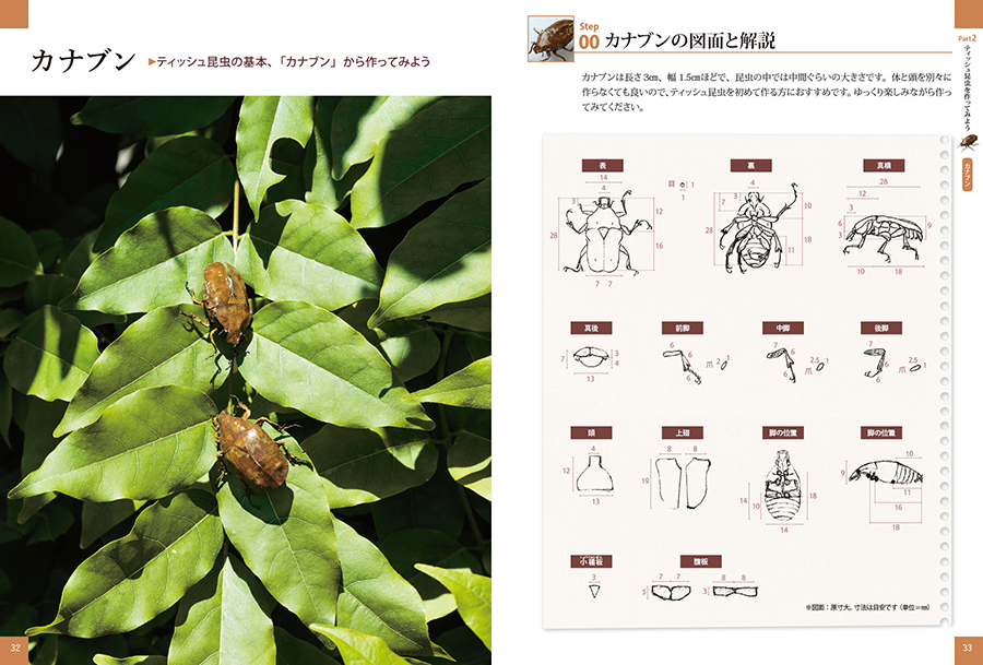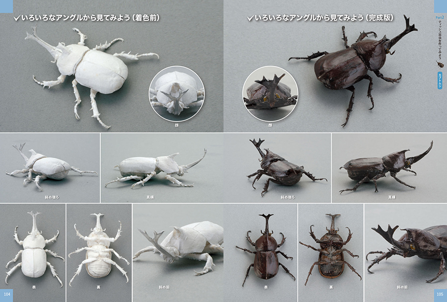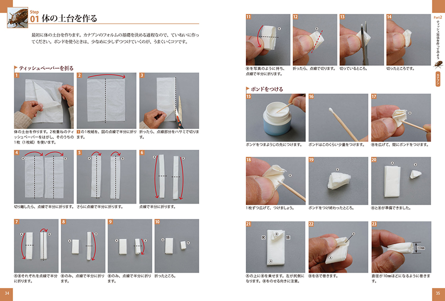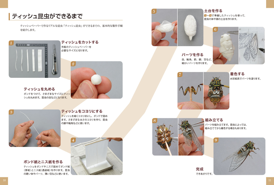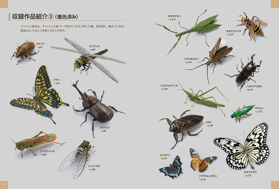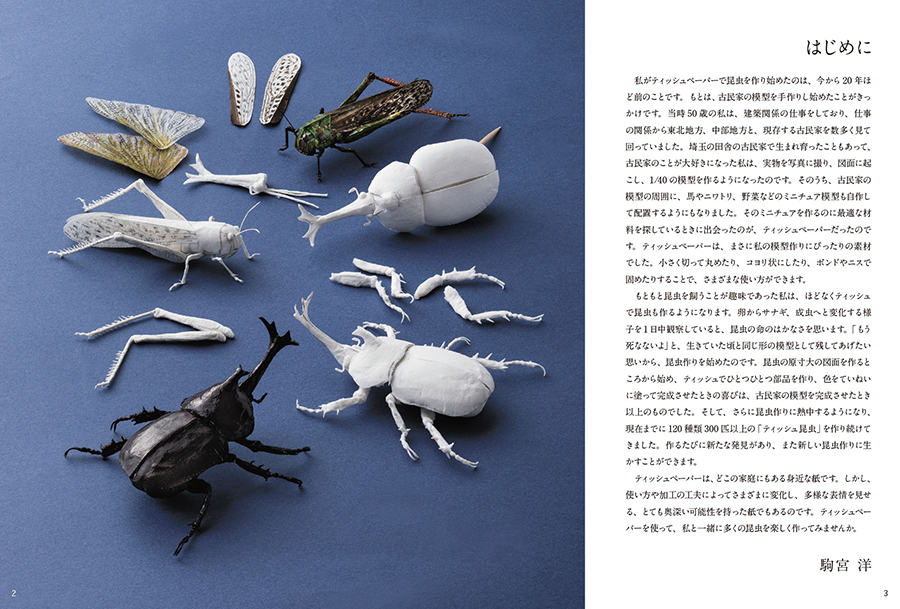 同書では、ティッシュペーパー数枚と身近にある道具のみを用いて作られる駒宮ティッシュ昆虫の制作過程を、写真で順を追って詳細に解説。道具・素材の選定、基本技術から組立・着色まで、駒宮のテクニックを1冊で学べる内容です。カブトムシ、クワガタをはじめ、カナブン、カマキリ、カミキリムシ、タガメ、タマムシ、バッタ、チョウなど、掲載作品も多彩。