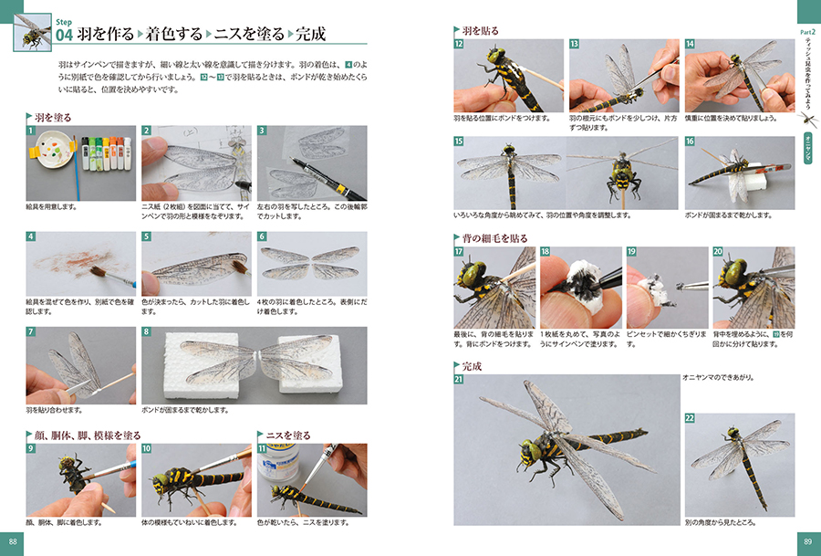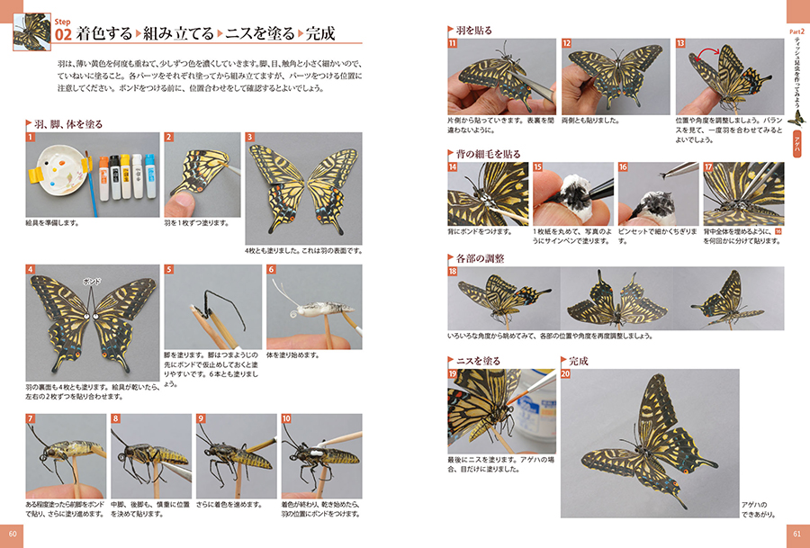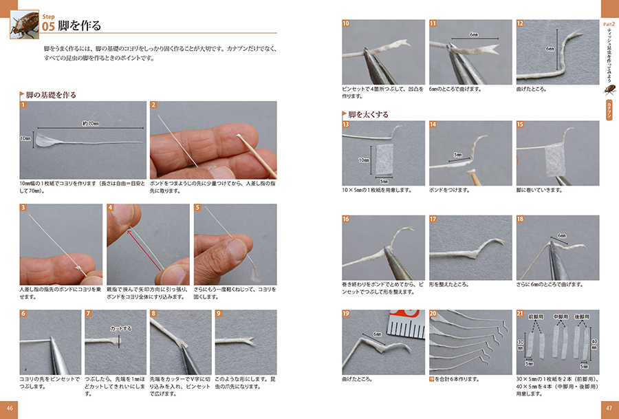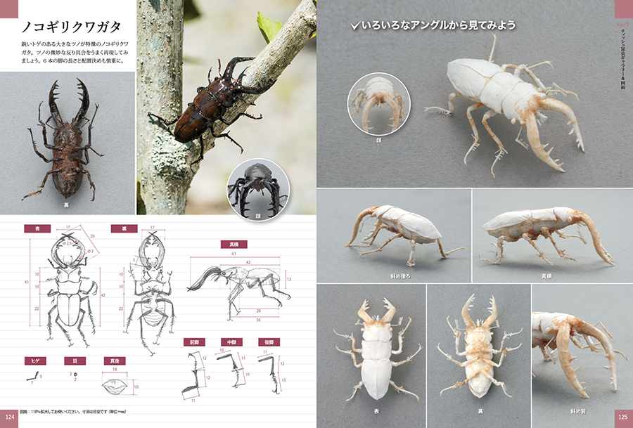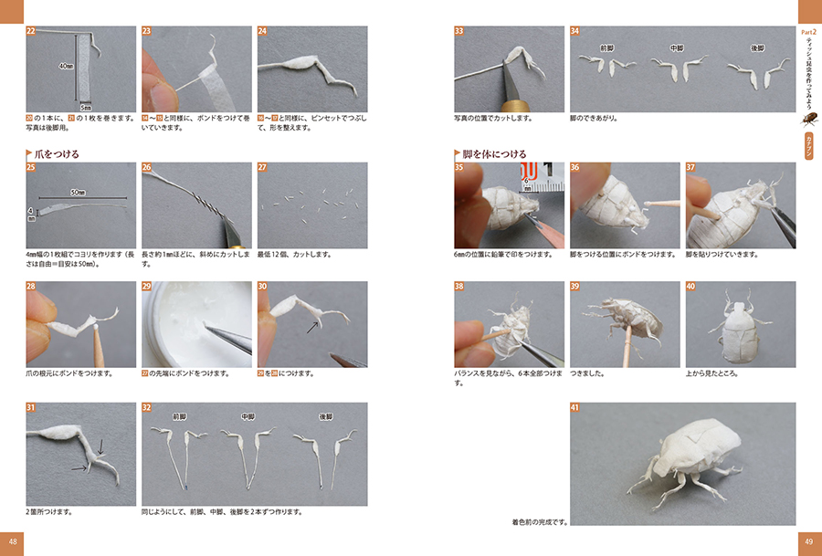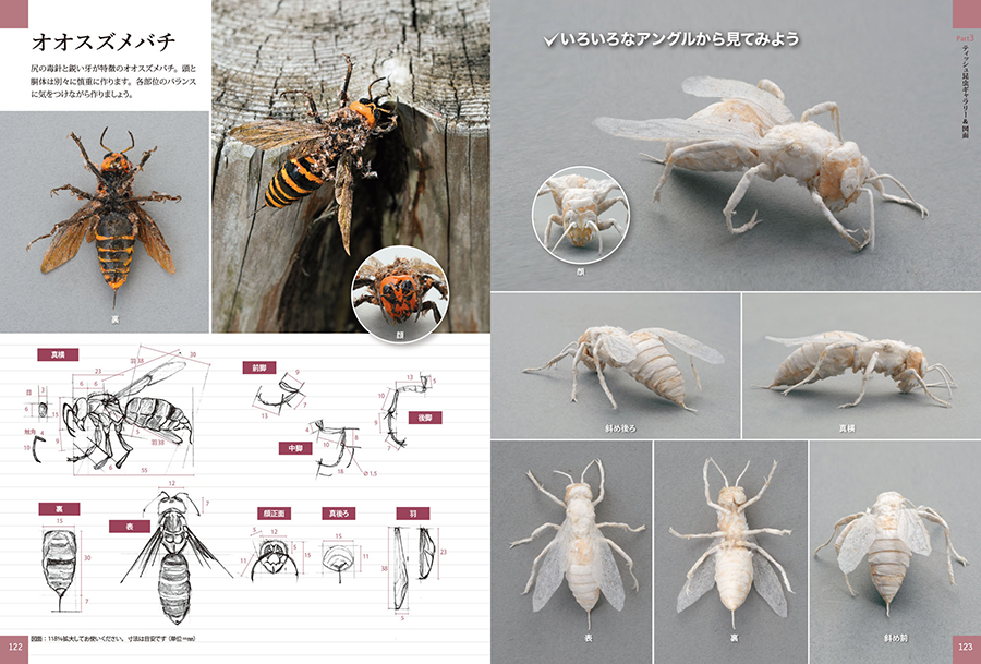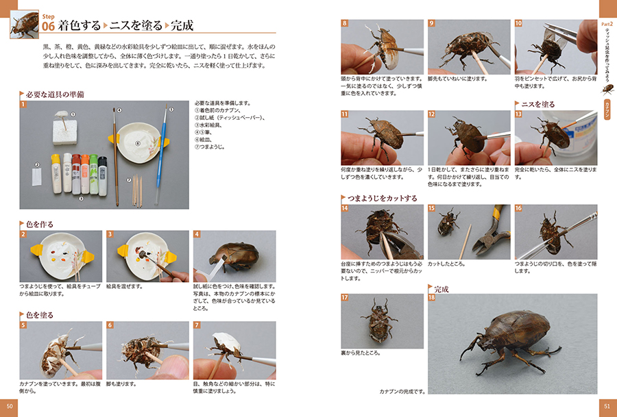 同書では、ティッシュペーパー数枚と身近にある道具のみを用いて作られる駒宮ティッシュ昆虫の制作過程を、写真で順を追って詳細に解説。道具・素材の選定、基本技術から組立・着色まで、駒宮のテクニックを1冊で学べる内容です。カブトムシ、クワガタをはじめ、カナブン、カマキリ、カミキリムシ、タガメ、タマムシ、バッタ、チョウなど、掲載作品も多彩。