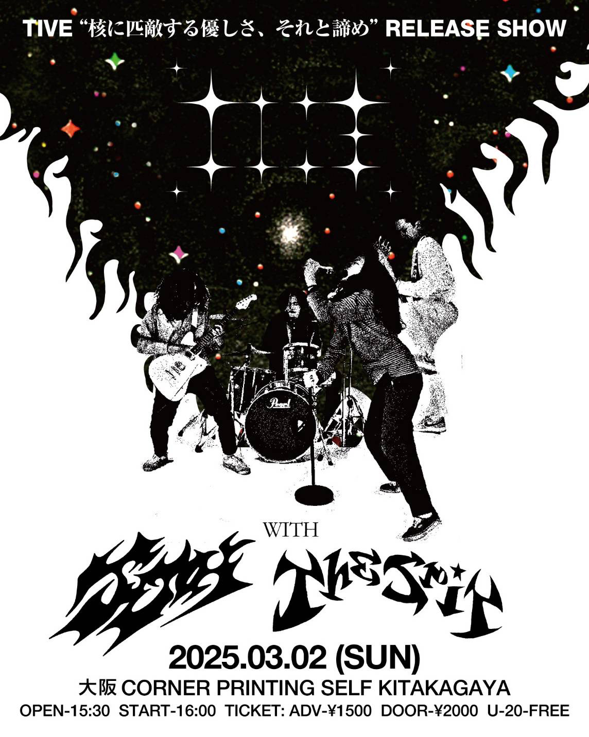 3月2日(日)には、同作のリリース・ショウを大阪・北加賀屋 CORNER PRINTING SELF 北加賀屋店にて開催。東京よりTHE SPIT、広島よりSUGARの出演が決定しています。同公演では、『核に匹敵する優しさ、それと諦め』のカセットテープ・エディション(Excelled Records)を限定販売。TIVEロゴをお好みのボディにシルクスクリーンでプリントできるワークショップも実施されます。