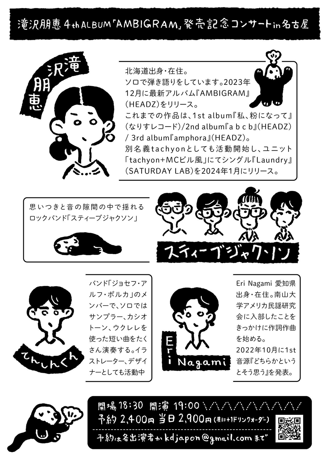 なお滝沢は、『AMBIGRAM』発売記念コンサートを5月5日(日)に愛知・名古屋 KDハポン、6月7日(金)には京都・錦林車庫前 外でも開催。KDハポン公演ではeri nagami、スティーブジャクソン、てんしんくん、外公演ではLe Makeupとの共演が決定しています。