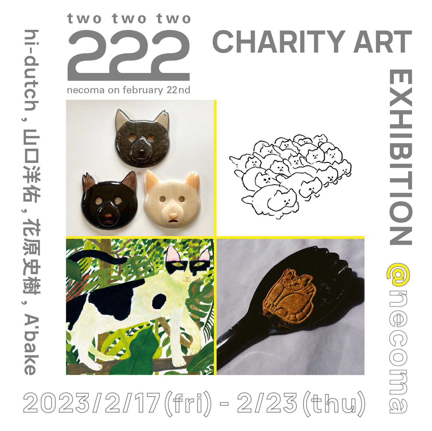 里親を待つ保護猫と店内で触れ合える東京・学芸大学のカフェ / ギャラリー・スペース「保護猫喫茶 necoma」が、売上の一部を保護団体への寄付に充てるチャリティ・アート・エキシビション「two two two -222-」を2月17日(金)から23日(木)まで開催。
