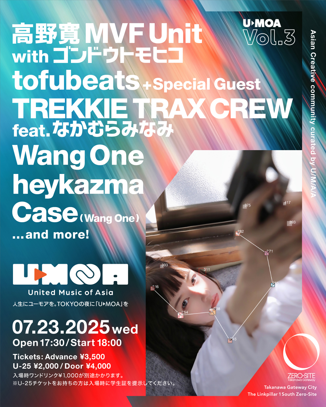 音楽レーベル「U/M/A/A」が、7月末まで東京・高輪ゲートウェイに期間限定オープン中のヴェニュー・ZERO-SITE Takanawa Gatewayにて、アジア圏にフォーカスしたイベント「U▷MOA (United Music Of Asia) vol.3」を7月23日(水)に開催。