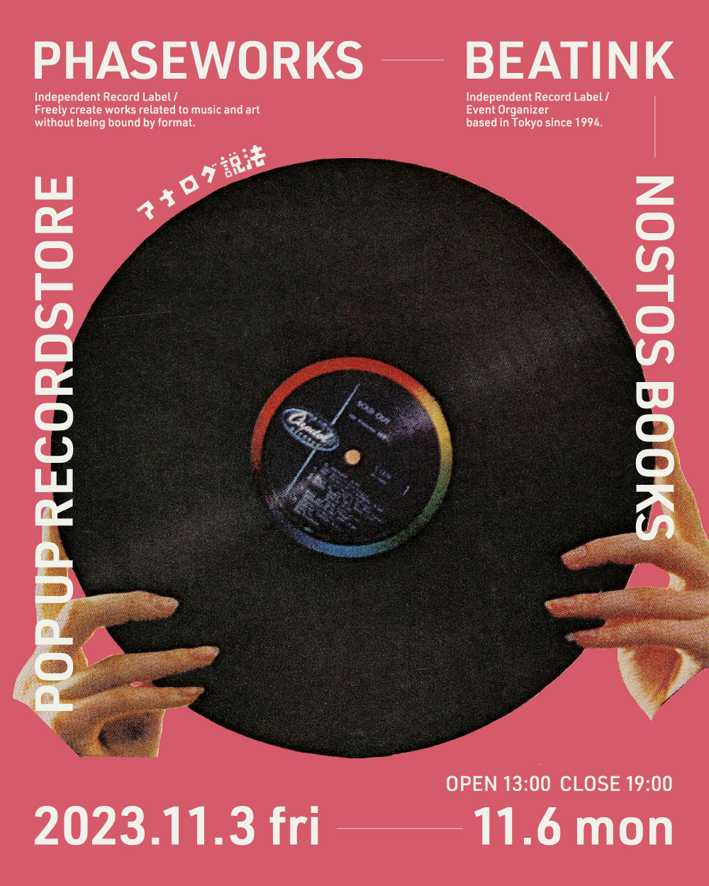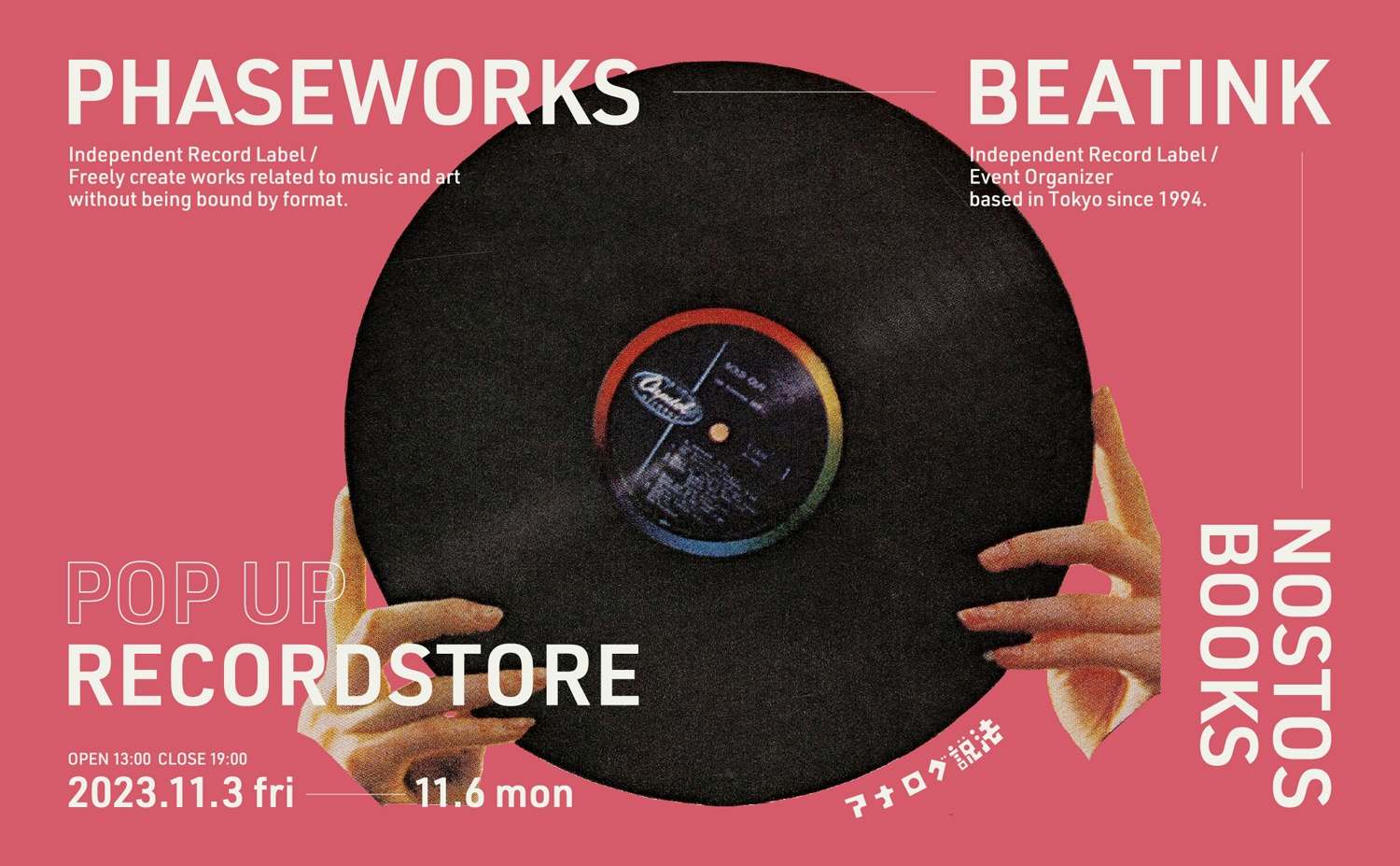 8月の開催では東京・三軒茶屋「Kankyō Records」を迎えて話題となったnostos booksのポップアップ・レコード・ストア。今回の「アナログ説法」には、Steve Goodman aka Kode9主宰「Hyperdub」、Adrian Sherwood主宰「On-U Sound」や「4AD」「Warp Records」「XL Recordings」といった重要レーベルの作品を一手に担う「BEATINK」と、近年は河西裕之 aka Cutsigh(AUDIO ACTIVE)の作品リリースやShohei Otomoとのコラボレーション、こだわりオリジナル・アイテムの販売などが好評を博している「Phaseworks」が出店。BEATINKはスタッフ厳選の名盤 / 新譜、Phaseworksはレーベル作品に加えてファウンダー・小西 力の私物コレクションからの出品が予定されています。