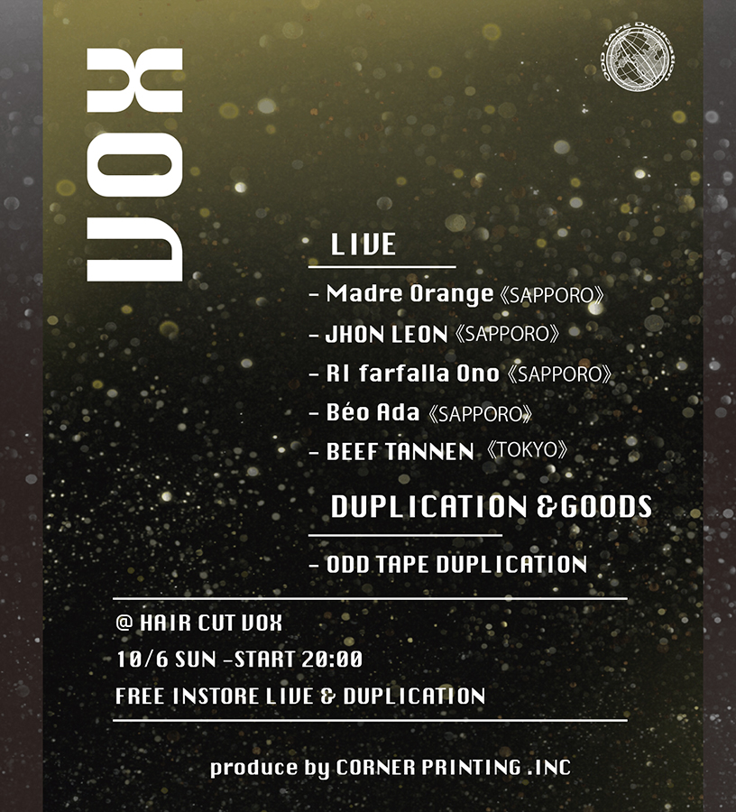 床屋のテクニークと美容室のアトモスフィアを兼ね備えた理髪店としてのみならず、インポートのカセットテープ作品を多く取り揃えたミュージック・ストアとしても話題を呼んでいる北海道・札幌「Haircut VOX」が、同地のトラックメイカーが出演するインストア・ライヴをプリンティング・カンパニー「CORNER PRINTING」のプロデュースで10月6日(日)に開催。