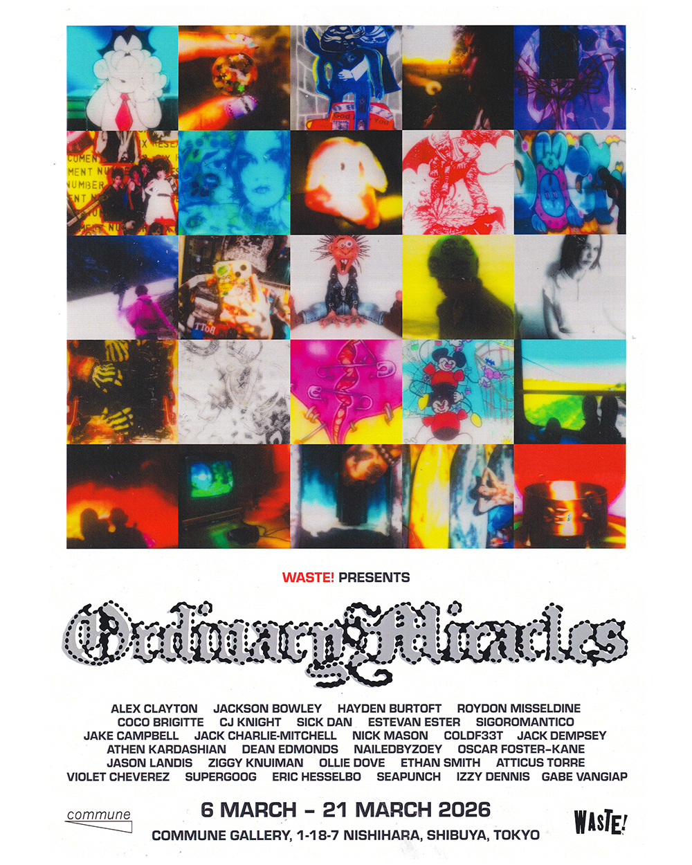 アパレル、スケートボード・デッキ、ジン、カセットテープなどを取り扱うイギリスはロンドン・ハックニーのカルチャー・ショップ / スペース「WASTE!」が、グループ・エキシビション「Ordinary Miracles」をキュレーション。3月6日(金)から21日(土)まで東京・幡ヶ谷 gallery communeにて開催されます。