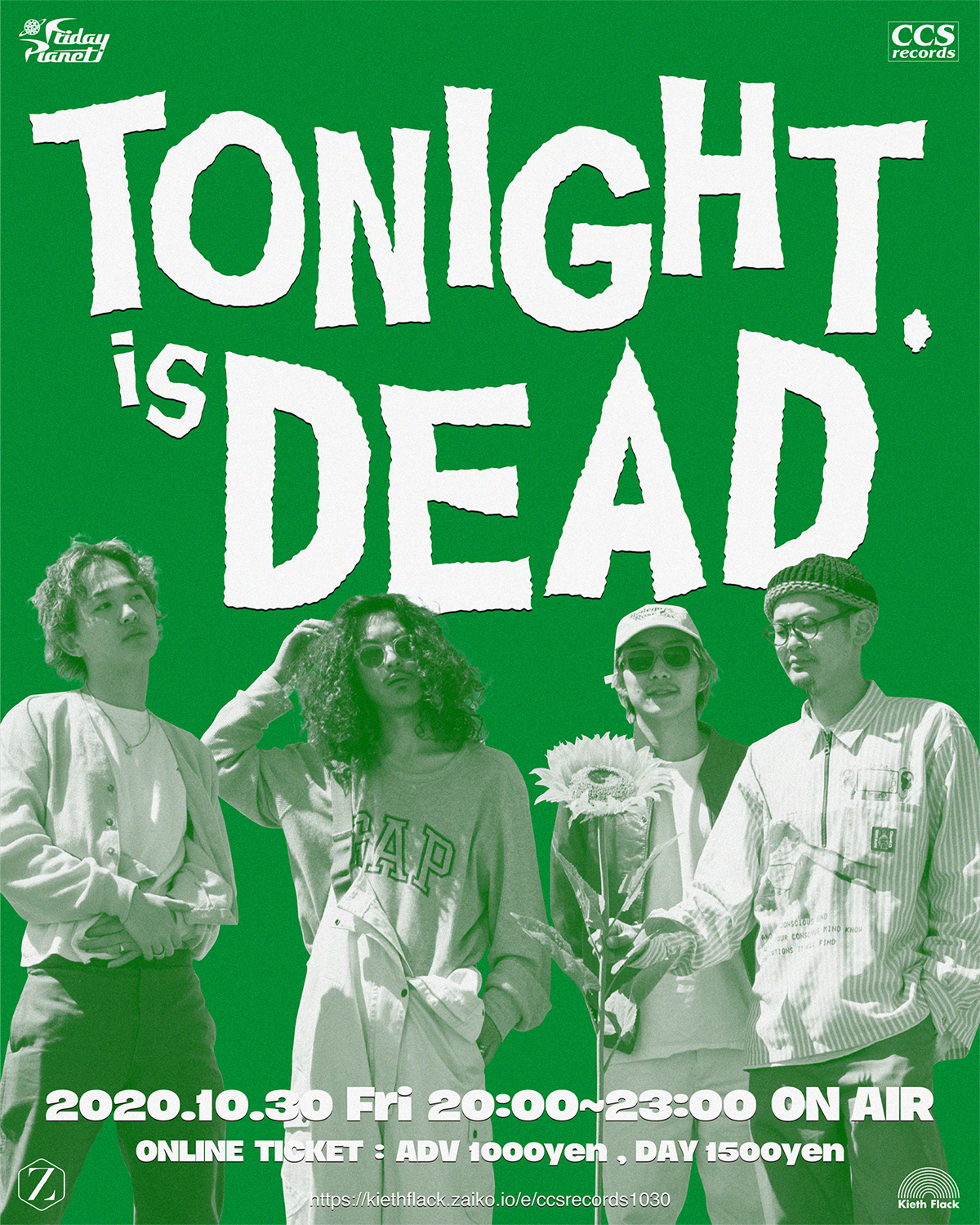 2度に亘る『Tonight.』リリース・パーティの中止を経て、オウンド・レーベル「CCS records.」による新企画「FRIDAY PLANET」の第1弾として開催される「Tonight. is Dead」は、福岡・天神のライヴハウス「Kieth Flack」から配信。週末CITY PLAY BOYZに加えてCalli Stephus、MADLISK、RYUTAROの出演も決定しているほか、限定スペシャル・アイテムの販売も予定。なお同公演は、視聴中の投げ銭が可能です。前売チケットの販売は10月29日(木)23:59まで。