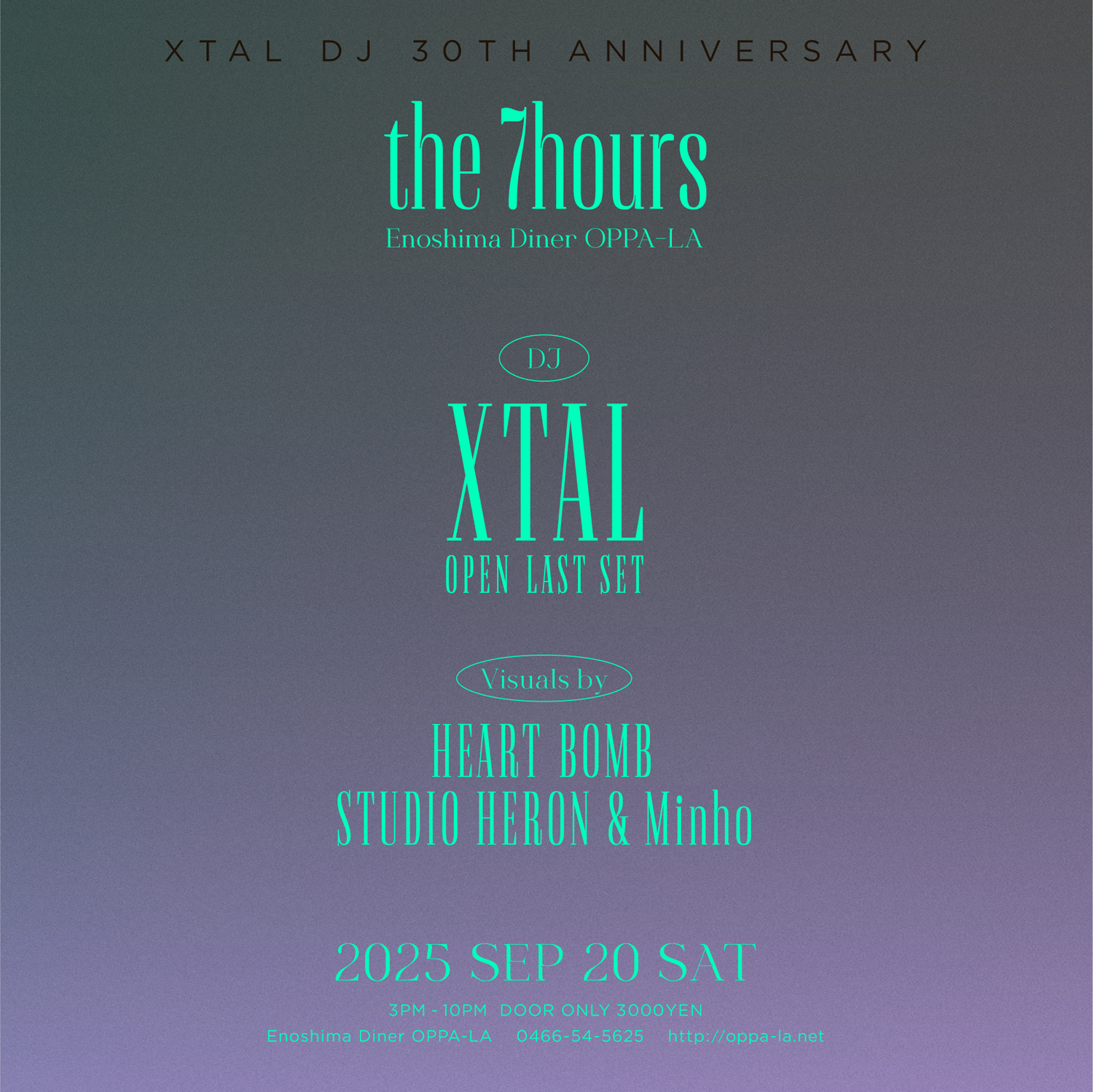 昨年はAchico、潮田雄一、畳野彩加(Homecomings)をゲストに迎えて制作された3rdソロ・アルバム『EKO』(カクバリズム)を発表して話題となったXTALが、オープンラストでスピンする「the 7hours」を9月20日(土)に神奈川・江ノ島 OPPA-LAにて開催。当日に先駆けてHEART BOMB / STUDIO HERON & Minhoによるメイン・ヴィジュアルが公開されています。