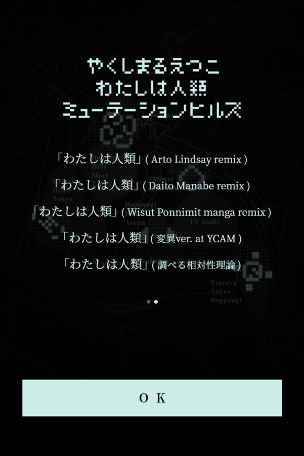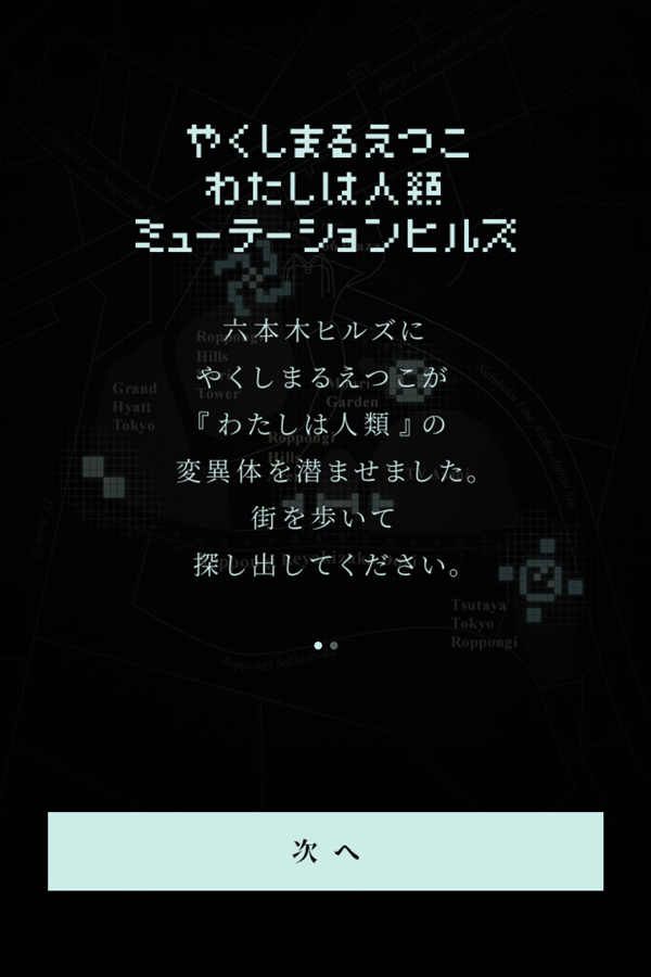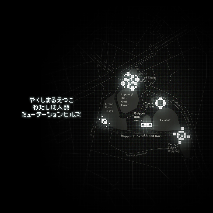 加えて、2月14日(金)から六本木ヒルズを舞台にした特別企画「わたしは人類: ミューテーションヒルズ」がスタート。スマートフォンで特設サイトにアクセスして六本木ヒルズを歩き回ることで、やくしまるが仕掛けた『わたしは人類』の“変異体”5種を探索するユーザー参加型企画です。各“変異体エリア”に到達すると、初公開のArto Lindsay、真鍋大度によるリミックス・トラック、“タムくん”ことウィスット・ポンニミットが『わたしは人類』をモチーフに描き下ろしたマンガ作品、2ヴァージョンのライヴ音源を含む計5種の音楽や画像が体験できます。同企画は3月29日(日)まで実施。